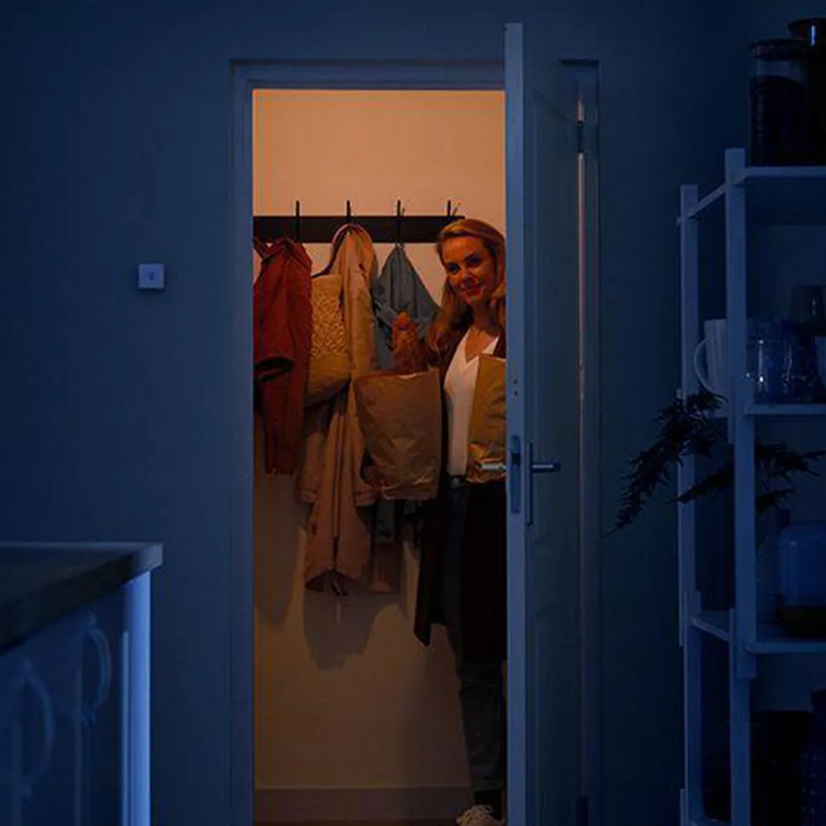 WiZ trådløse innendørssenor lar lysene skru seg av og på i forhold til bevegelse. Plasser den ved inngangen til en korridor og så den skrur på de ønskede lysmodusene når du går forbi, still den inn så den skrur av eller minimerer lysstyrken når du går ut av rommet. Den styrer alle lysene i et rom og kan registrere bevegelse på inntil tre meters avstand. Still inn sensoren så den skrur på forskjellige lysmoduser til forskjellige tider på døgnet i WiZ-appen (f.eks. varmhvit til kvelden eller nattlampe etter leggetid).