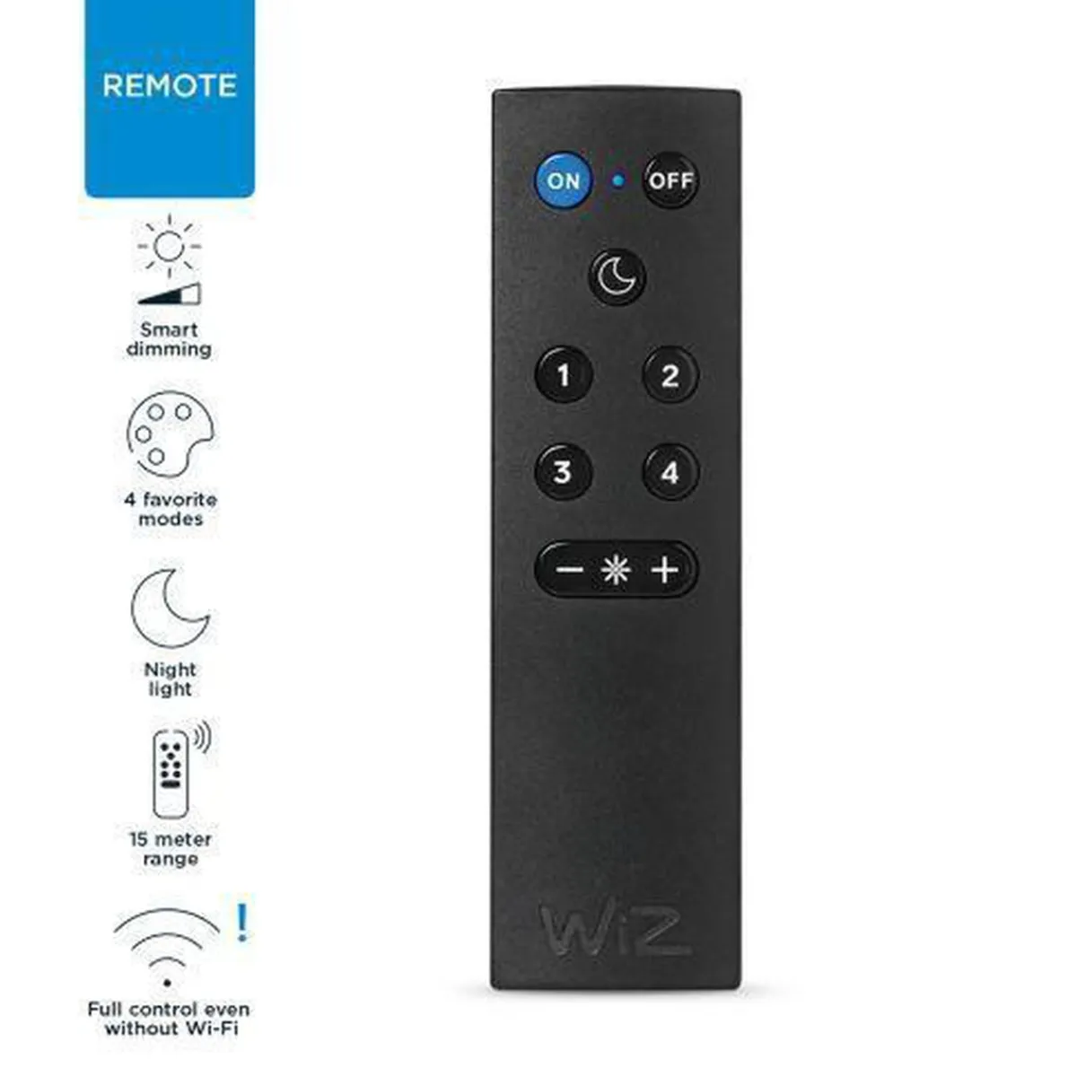 WiZmote gir deg rask og enkel kontroll over WiZ-lysene. Still inn lysene til å skru seg av og på, juster lysstyrken og endre til nattlampe og velg mellom fire favorittlysmoduser ved å trykke på en knapp. Fungerer med alle tilkoblede WiZ-produkter og styrer alle lysene i et rom. Stort kontrollområde på opptil 15 meter og den fungerer selv om Wi-Fi er nede..