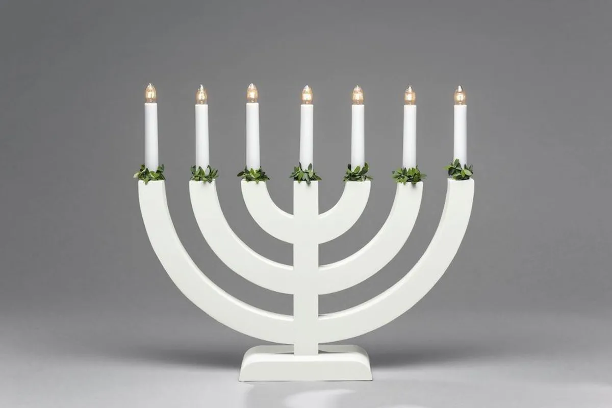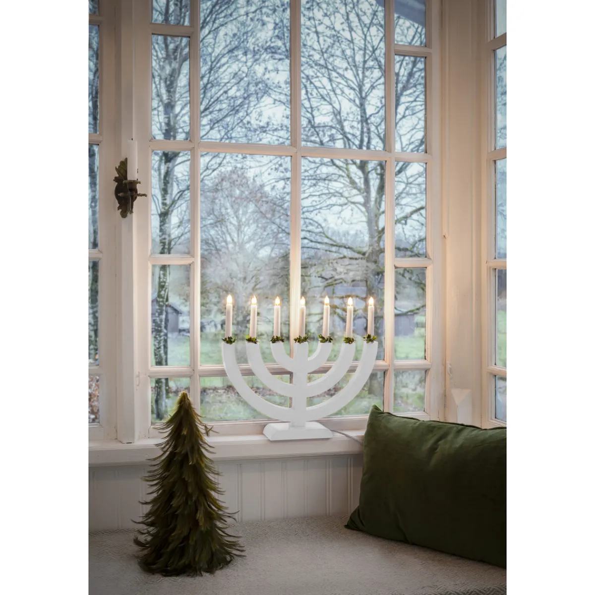 Hvit adventsstake med 5 armer og grønne mansjetter.