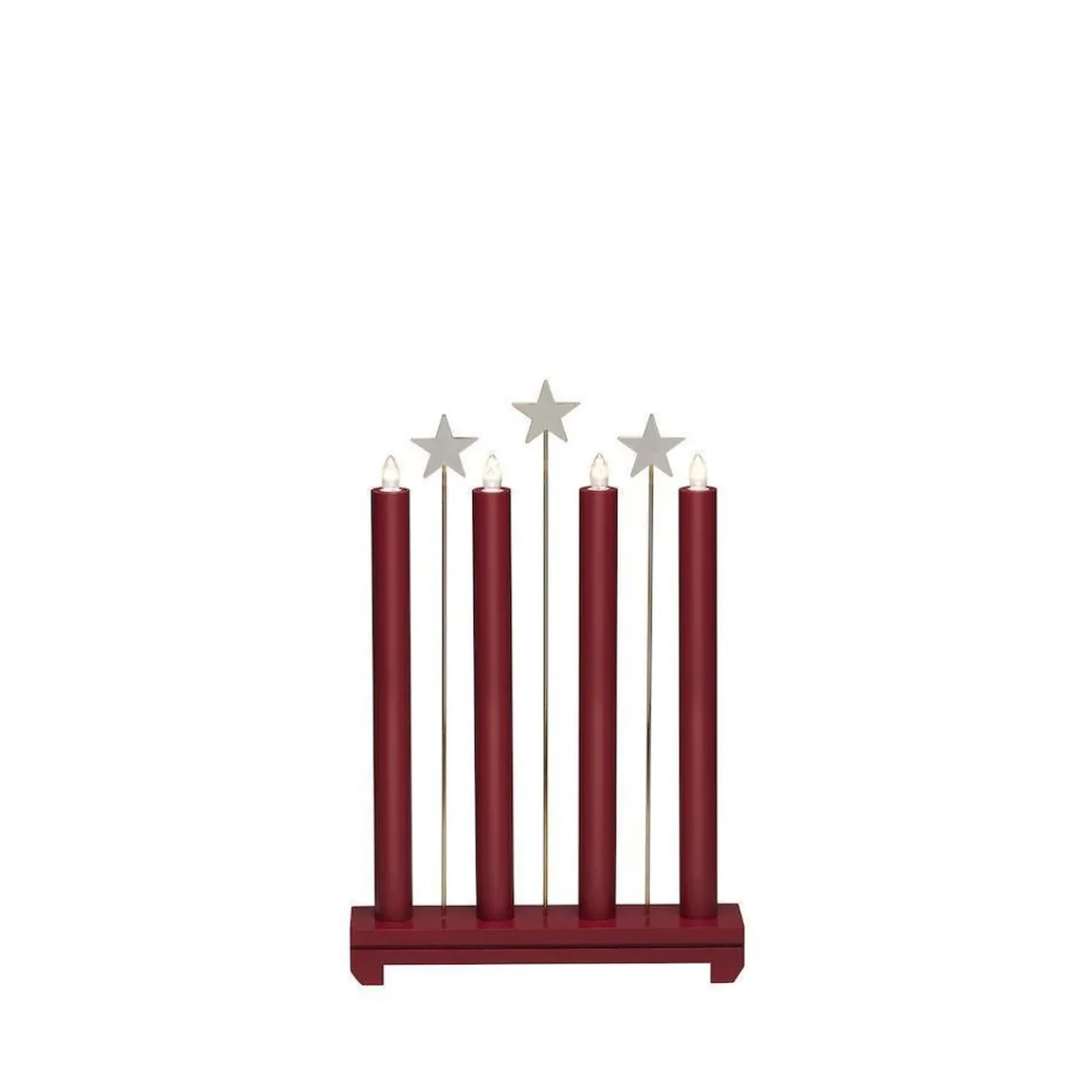 Kom i julestemning med den flotte adventsstaken i rød med 4 lys og 3 dekorstjerner.