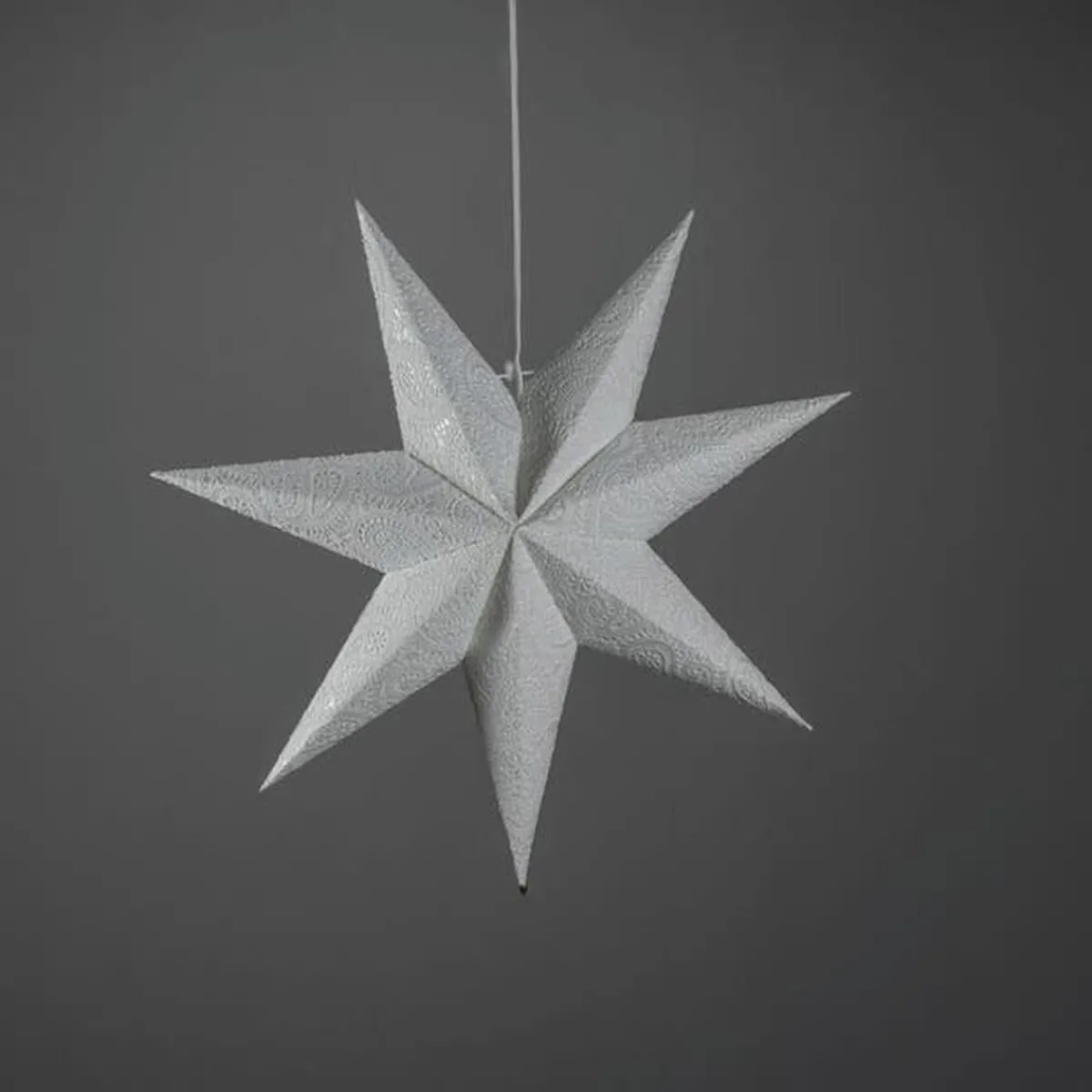 Hengende adventsstjerne med hvitt blondemønster, 7 punkter. Ledningsstativ med 5 meter tilkoblingsledning inkludert, E14-sokkel. Ledningsbryter. Diameter 80 cm.