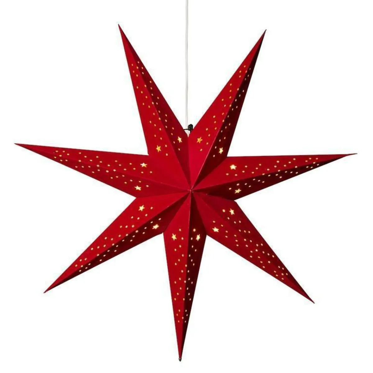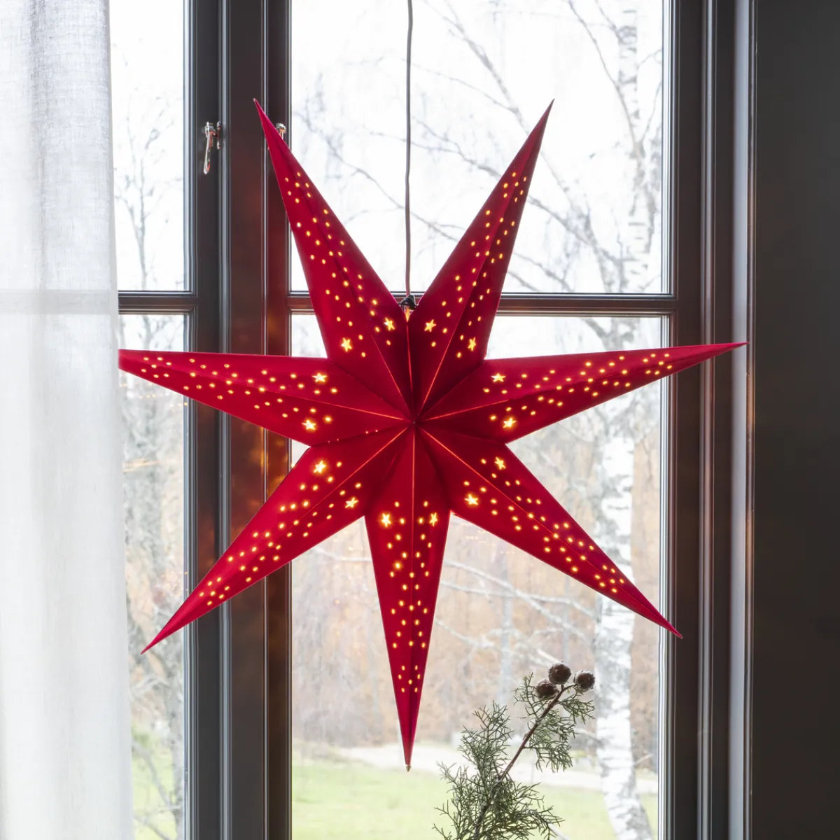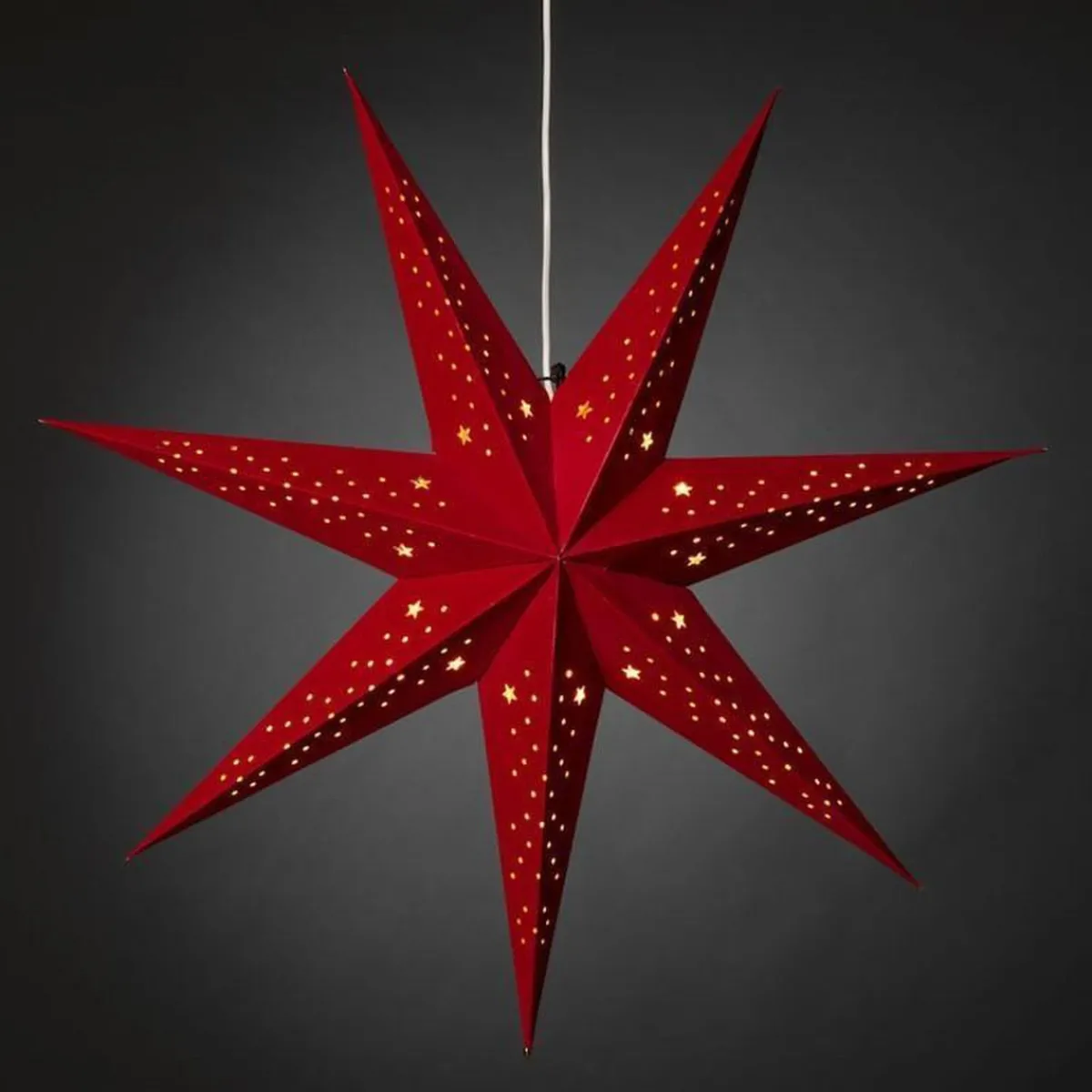 Pappstjerne 78 cm rød fløyel med gull innside. 7 armet. Inkludert oppheng. E14 lampeholder. Hvit kabel.