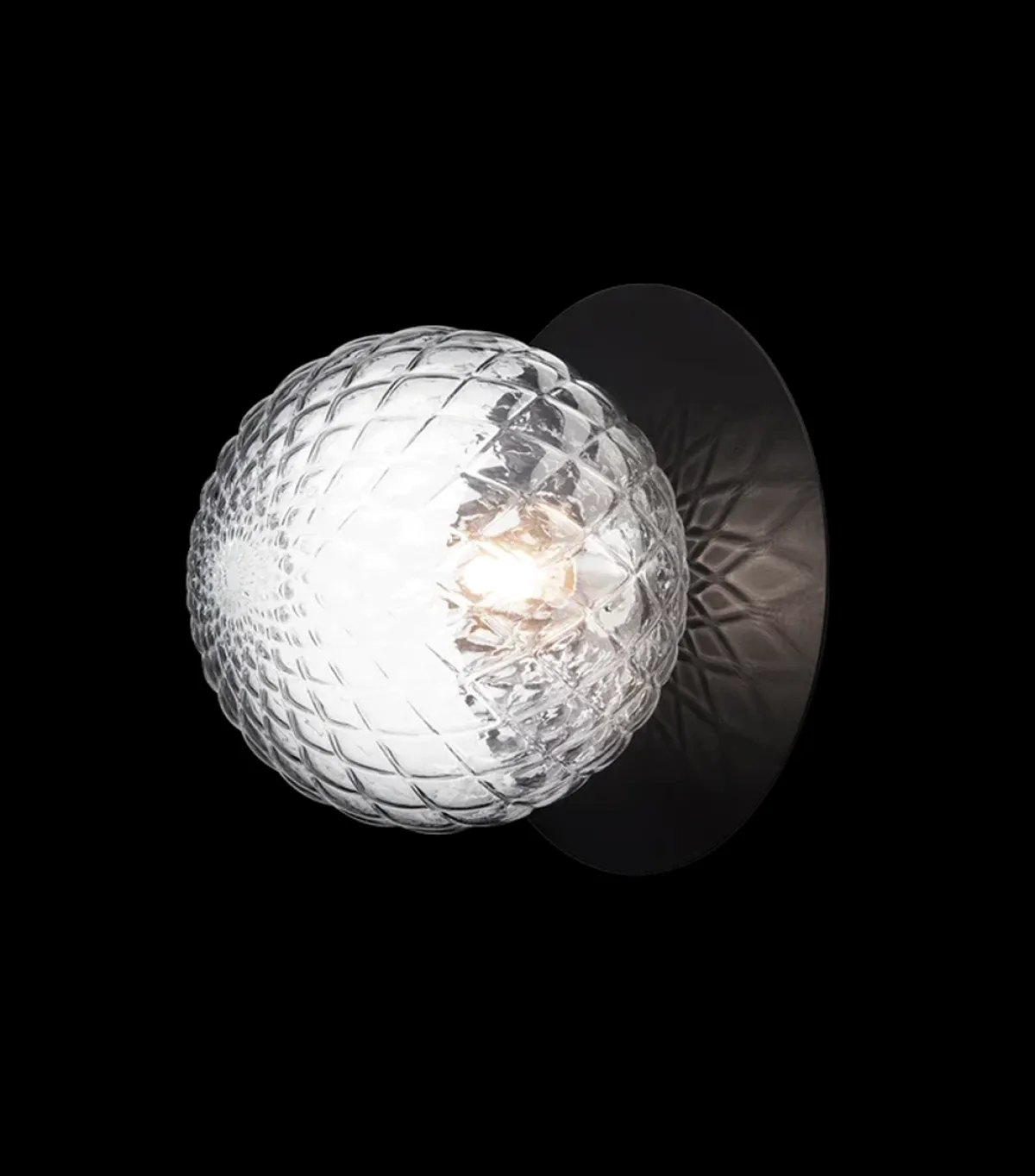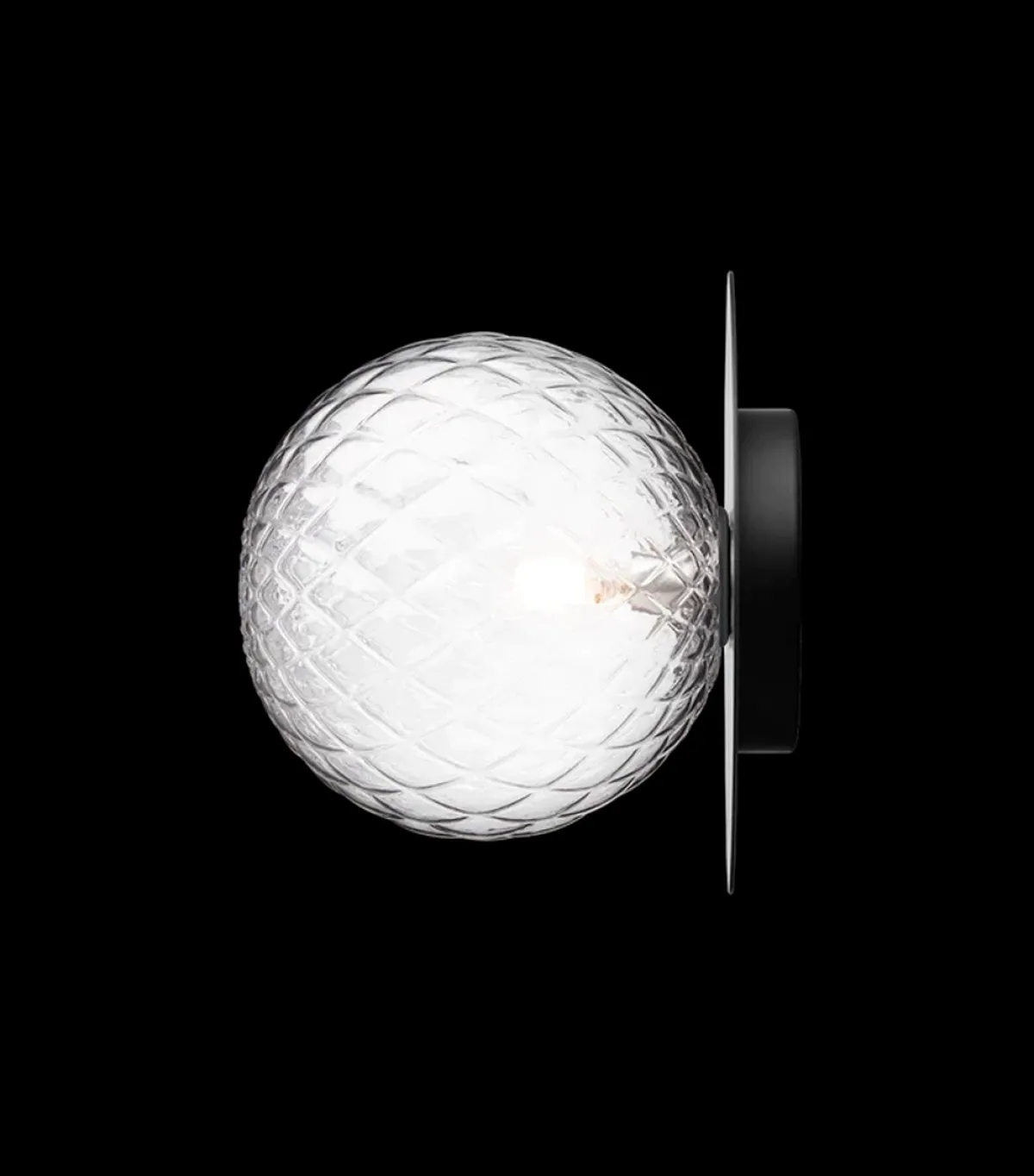 Liila 1 Large er en enkeltlampe som egner seg enten som innfelt taklampe eller som vegglampe, noe som gjør den svært relevant for ulike behov i hjemmet. En tynn metallskive i svart finish dekker basen mens en stor munnblåst glasskule i optikk glass fungerer som fokuspunktet for denne lampen. Liila 1 Large passer for gang, mindre rom og rom med lav takhøyde, og er godkjent for montering på bad.