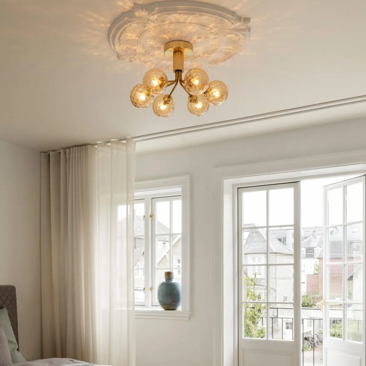 Med inspirasjon fra blomster bretter Apiales 6 Ceiling ut sine 6 metallarmer i børstet messing som blomsterstilker fra en spesialprodusert baldakin og støtter 6 munnblåste glasskuler i optic gold.