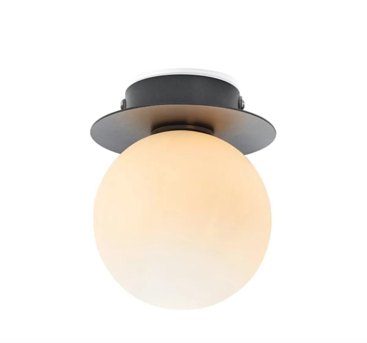 Baderomslampe fra Marksløjd i opalt glass og sort metall. Endelig noen baderomslamper i sort metall som passer perfekt når man har valgt mørkt bad, sorte armaturer og detaljer til badet. Også en fin kontrast til hvite fliser og marmorfliser.
