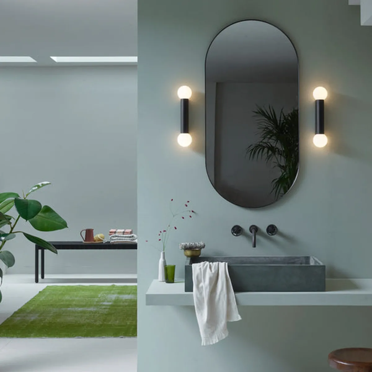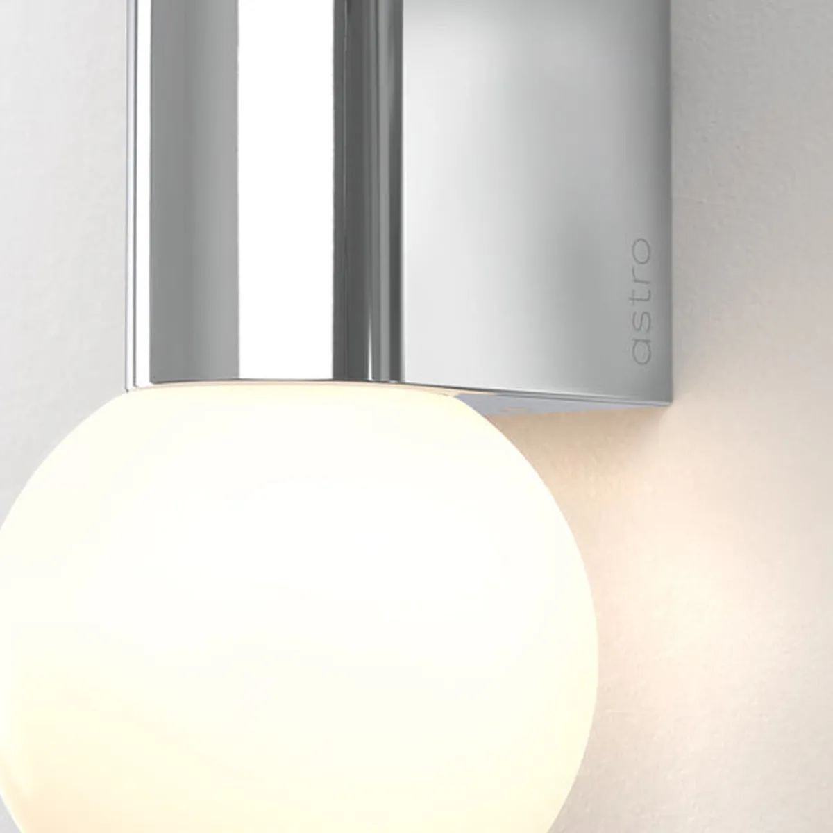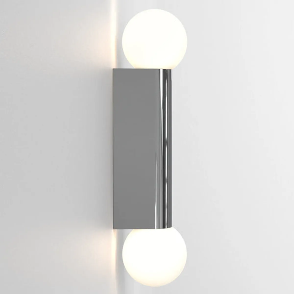 Den enkle og geometriske vegglampen til badet er designet for bruk sammen med speil og kan monteres vertikalt eller horisontalt. Kuppelen i opal glass sprer en omgivende glød.. IP44-klassifisert for sikker bruk for baderom.