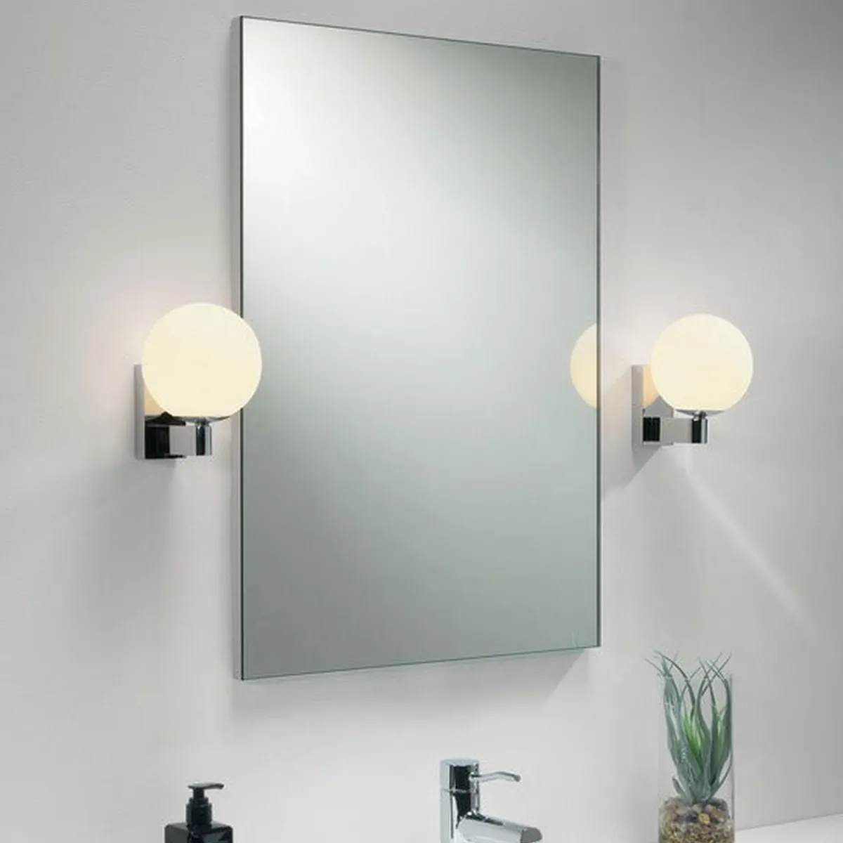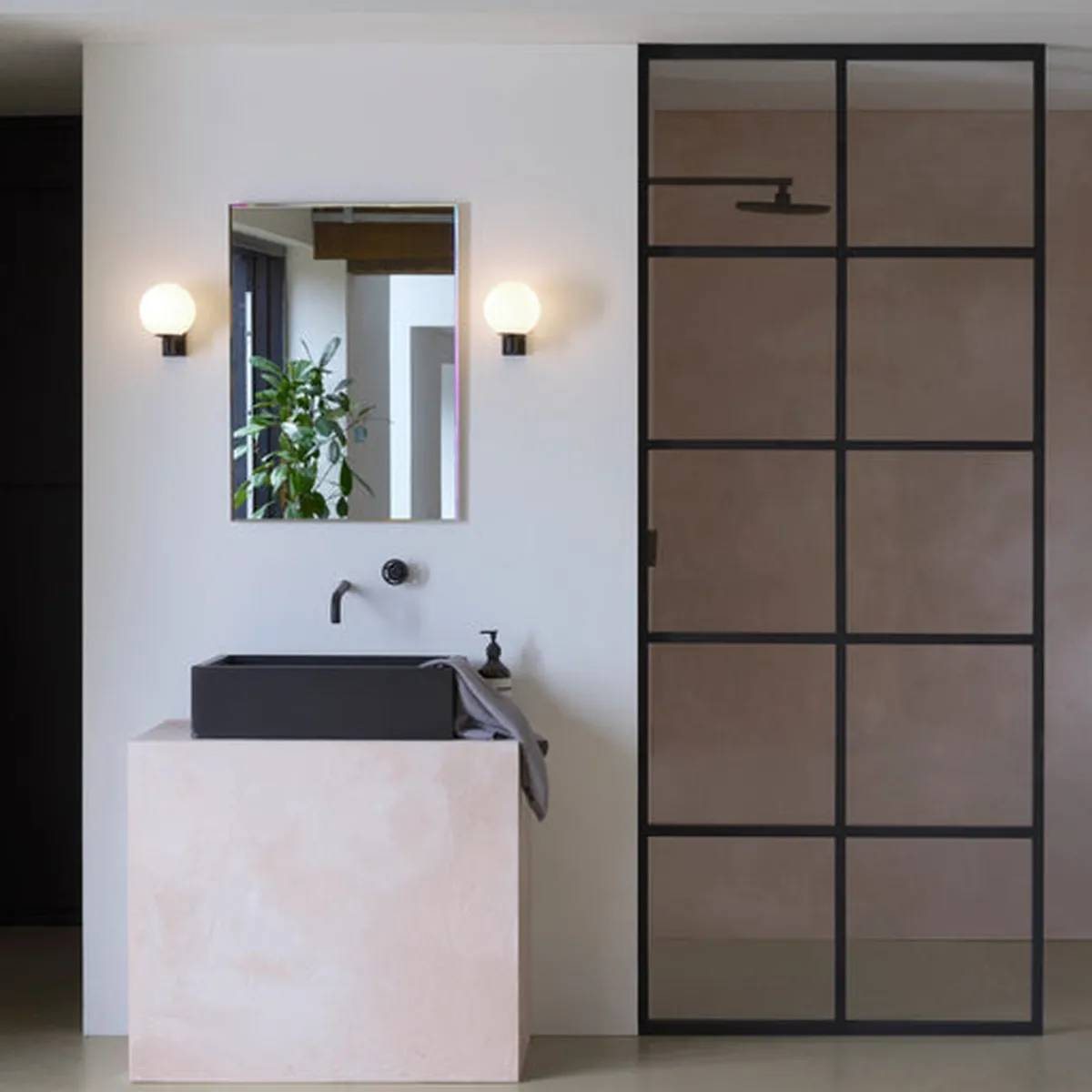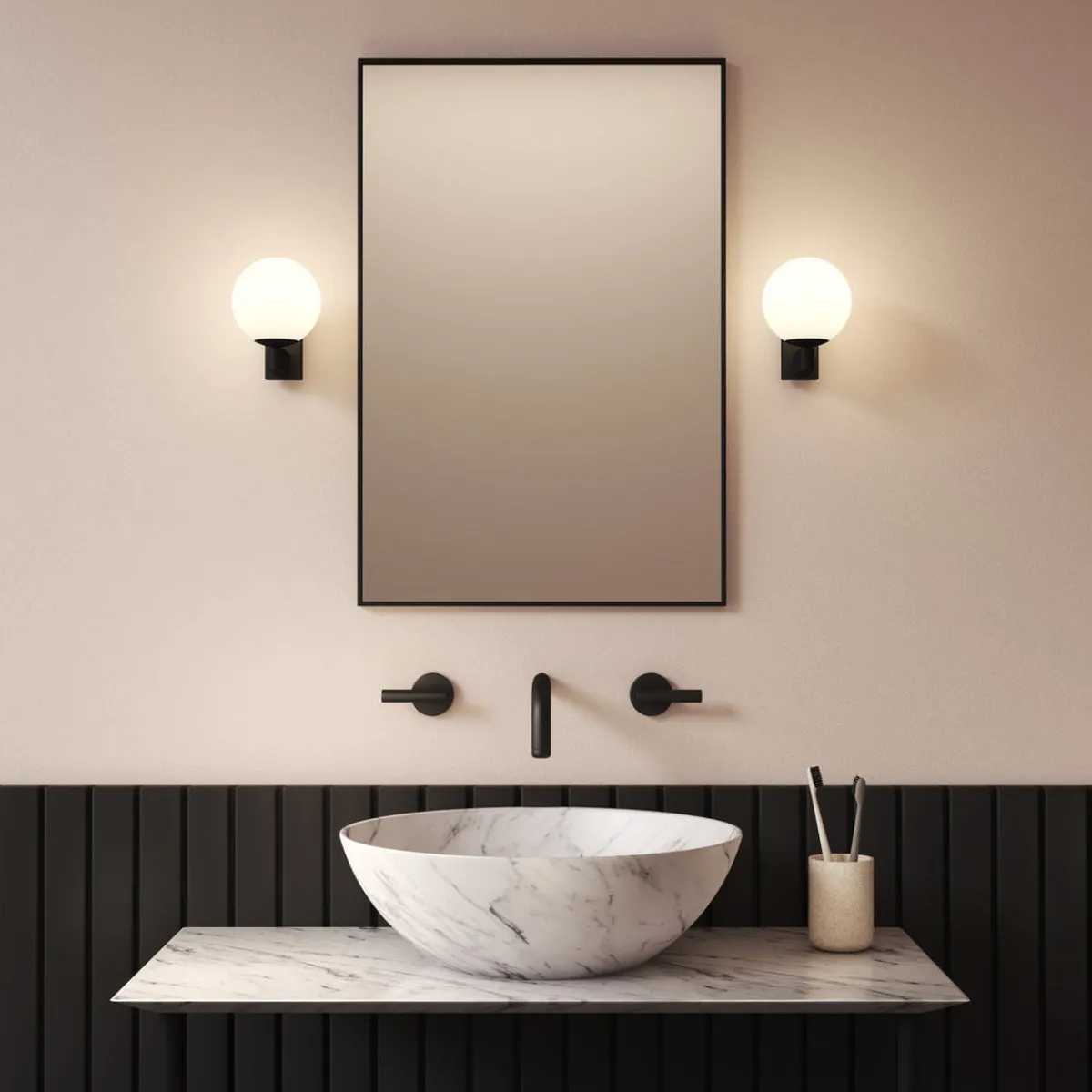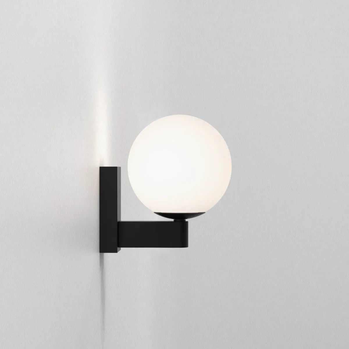 Stilren og moderne baderomslampe i matt sort metall og opalhvit kuppel i glass.