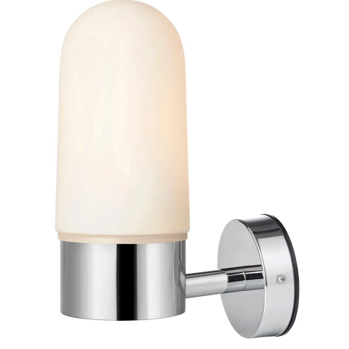 Nydelig vegglampe i kromfarge, egnet til bruk på baderom. Den opalhvite glasskuppelen gir et jevnt og behagelig lys.