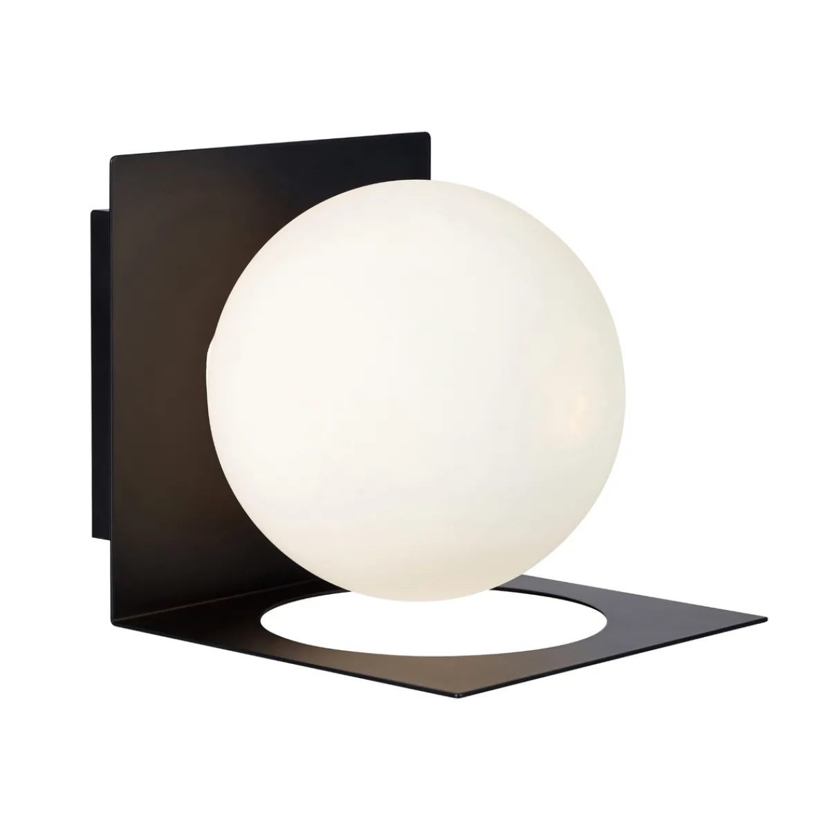 Stilig vegglampe med veggfeste i svartfarge og glasskuppel i opalhvit. Den opalhvite kuppelen gir et jevnt og behagelig lys.
