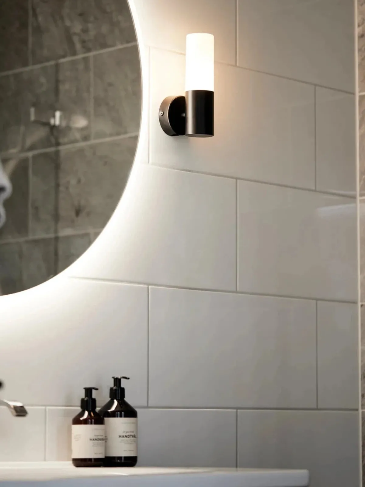 Vegglampe i minimalistisk design med opalglass og metallramme i matt sort. Lampen er beskyttet mot fukt i IP44-klassifisering og passer godt i baderomsmiljøer. Vær oppmerksom på at denne armaturen er for fast installasjon og ikke leveres med separat kontakt og tilkoblingskabel.