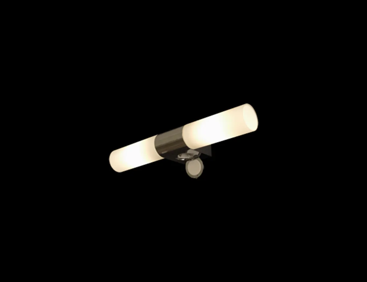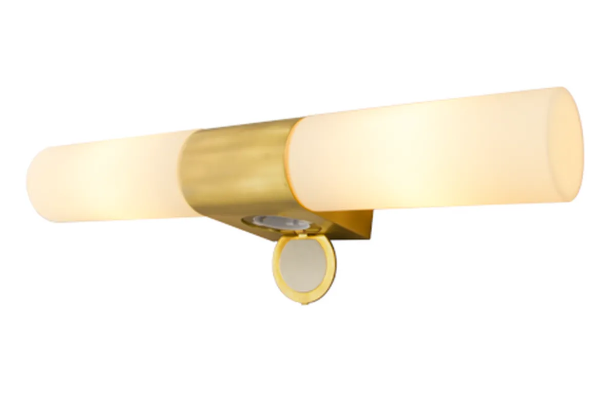 Lekker og praktisk vegglampe til baderom, i svart og opalhvit, med uttak til stikkontakt på selve lampen.