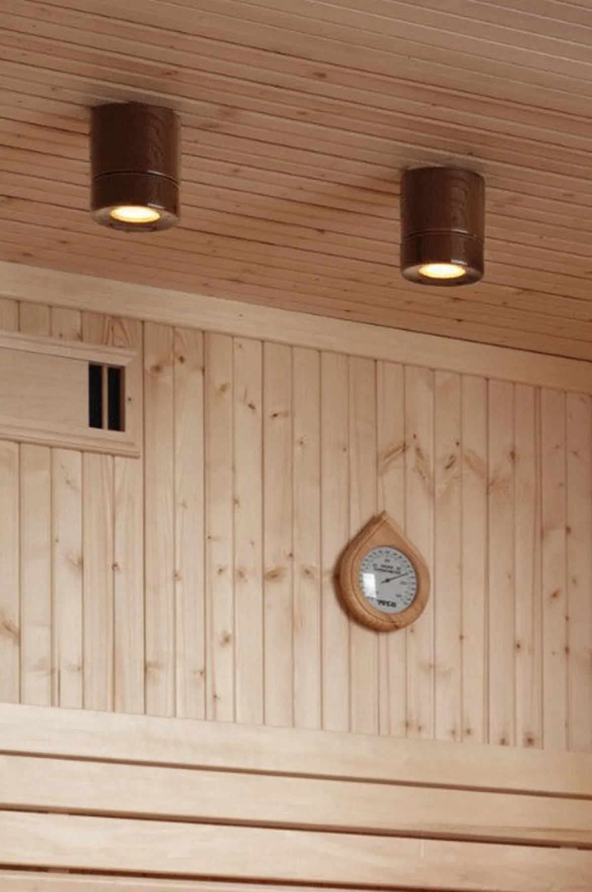 En keramisk armatur laget av kvalitetsporselen. Light On Downlight er designet av den kjente designeren Knud Holscher, beregnet for plassering i taket på badstuen.