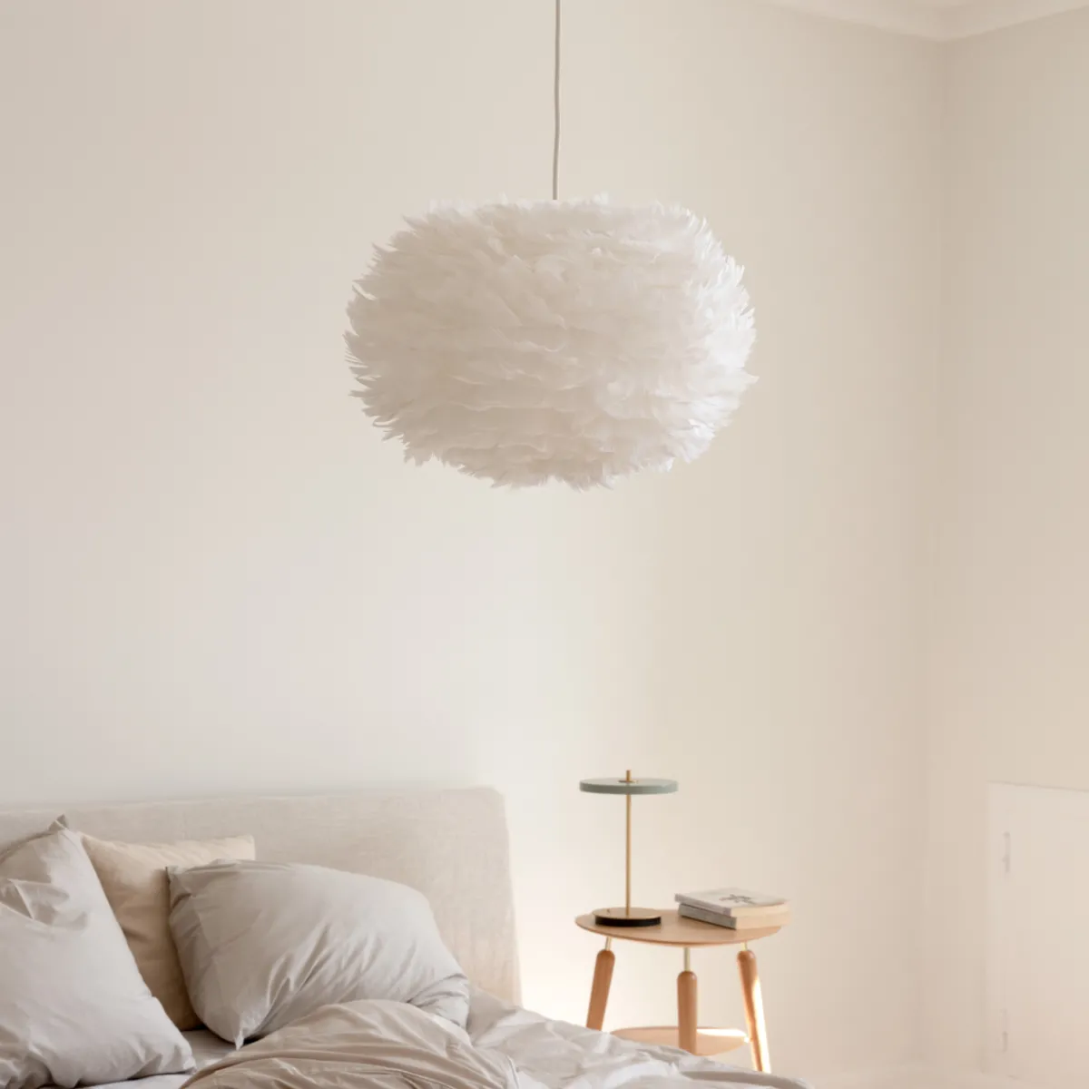 Eos-taklampe i medium måler 45 x 30 cm, noe som gjør den perfekt for kreative områder – heng de i varierende høyder i et stuehjørne eller i en rad over spisebordet. Den er laget av ekte gåsefjær.