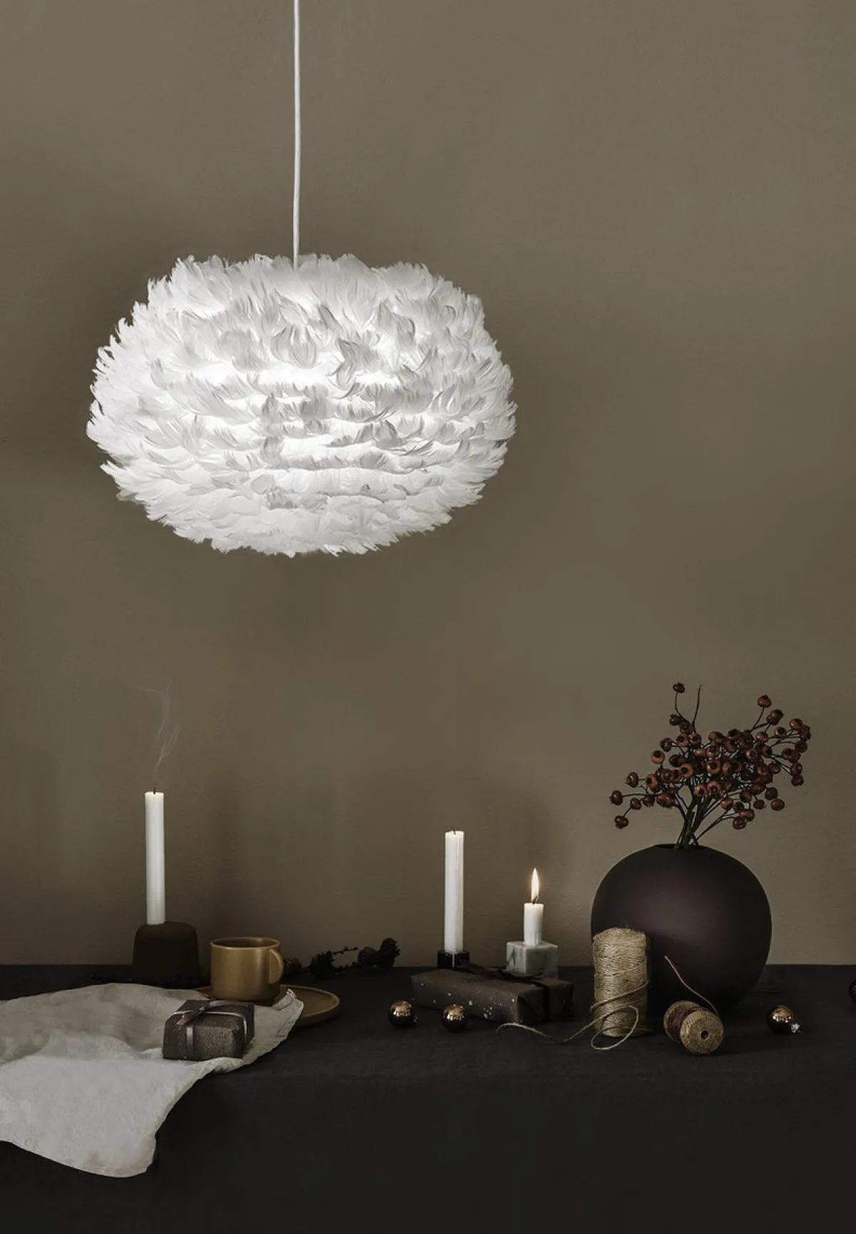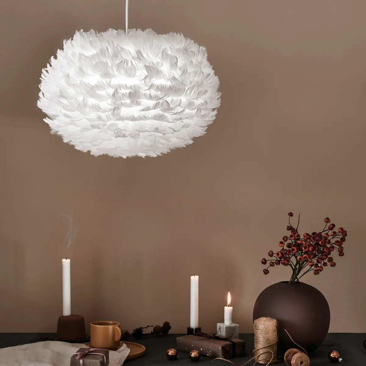 Det utstråler en myk og koselig glød. Siden lyspæren er skjermet, er Eos-fjærlampen perfekt som takpendel fra hvilken som helst høyde. Rutinemessig rengjøring av fjærlampen gjøres enkelt med en hårføner, og Eos-fjærlampen monteres ganske enkelt på nesten hvilken som helst type lampe i løpet av sekunder og kommer i vakker gaveeske.