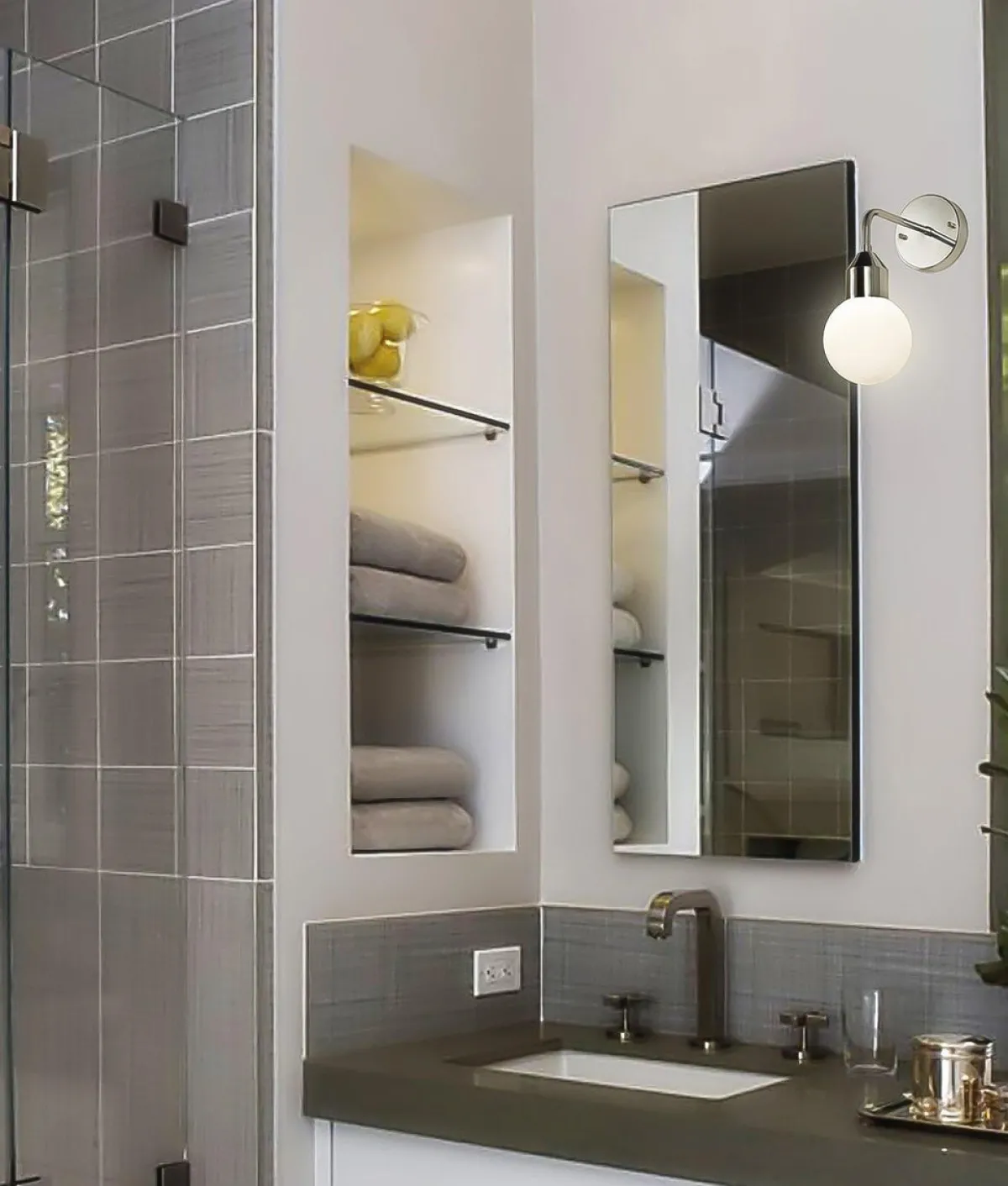 Dekorativ vegglampe for bad. Den hvite kuppelen er inkludert.