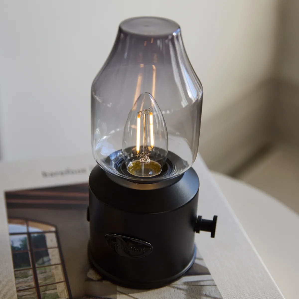 Populær oppladbar bordlampe nå i en versjon som tåler utendørs bruk og kan dimmes trinnløst, designet i en klassisk stil som minner om den gamle oljelampen vi en gang hadde men i ny og moderne årgang.