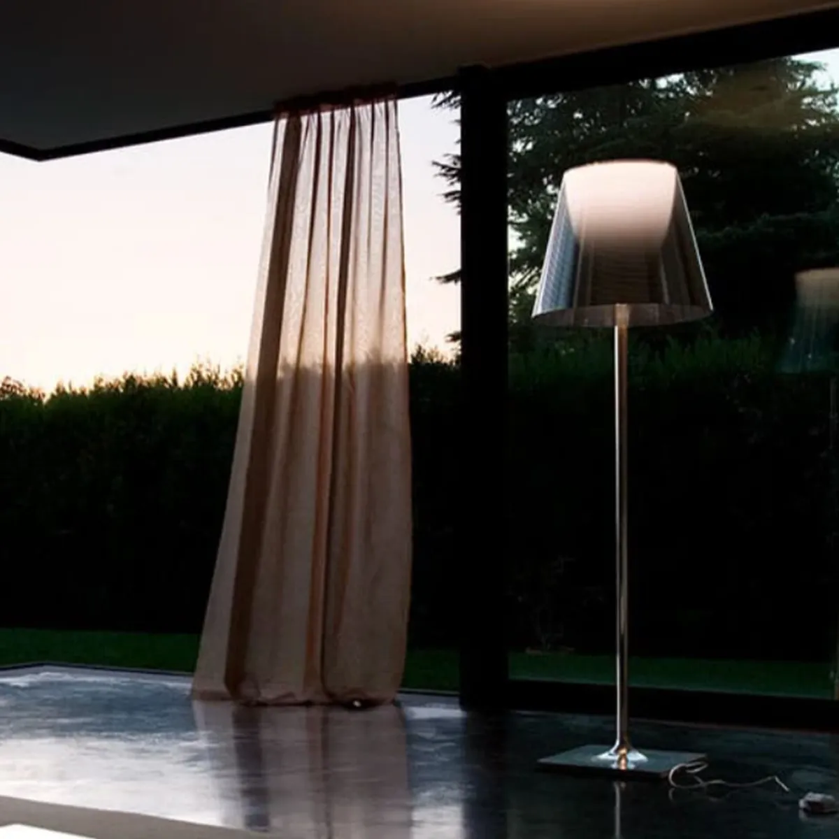 K Tribe F2 med bronsefarget skjerm er designet av Philippe Starck i 2007. Det er en elegant og stilsikker gulvampe hvor en kan ha mye lys i uten å bli blendet, da lyskilden ligger godt skjult inni en kuppel. Her får du meget godt med lys da en kan ha hele 150 watt i den. Den er også dimbar for stemningslys når man ønsker det.
