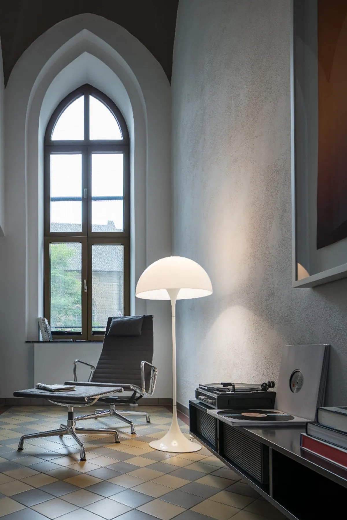 Med sitt blendefrie lys er Panthella gulvlampen et vakkert eksempel på Verner Pantons strålende sans for å skape stemningsfull belysning. Lampen gir alltid et høyt komfortnivå med mykt, diffust lys. Skjermen i opal/akryl etterlater en diffus, behagelig lysatmosfære på grunn av den gjennomskinnelige skjermen, den nedadgående refleksjonen fra den indre skjermen og refleksjonen fra trompetstammen.