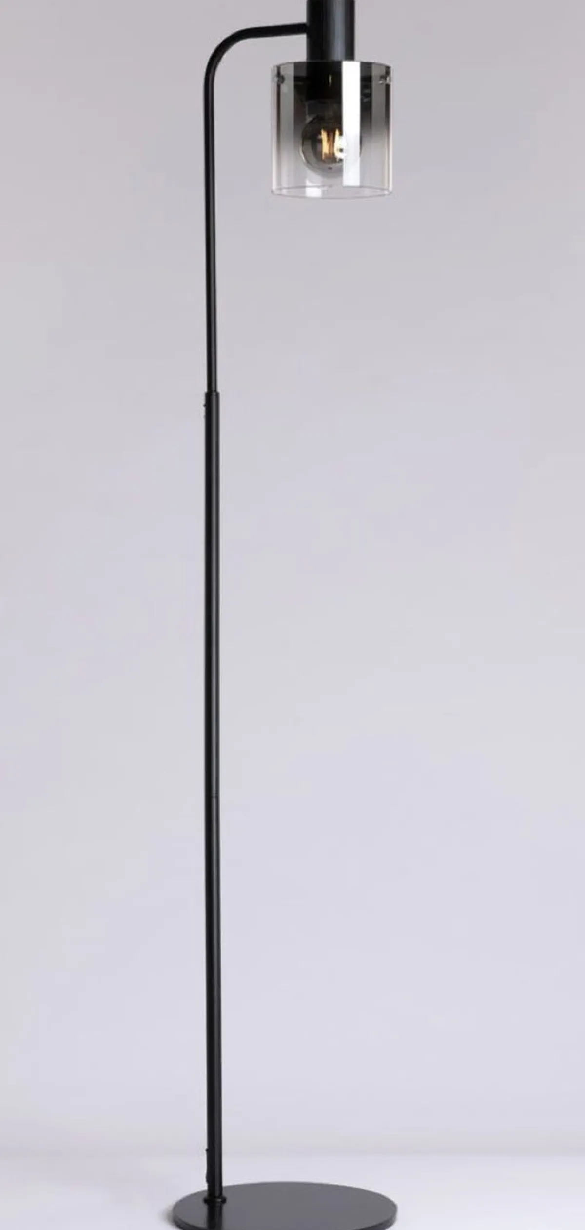 Roxy gulvlampe er moderne og i et lekkert minimalistisk design. Kuppelen er i røykfarget glass, som gir et lunt og lekker lys.