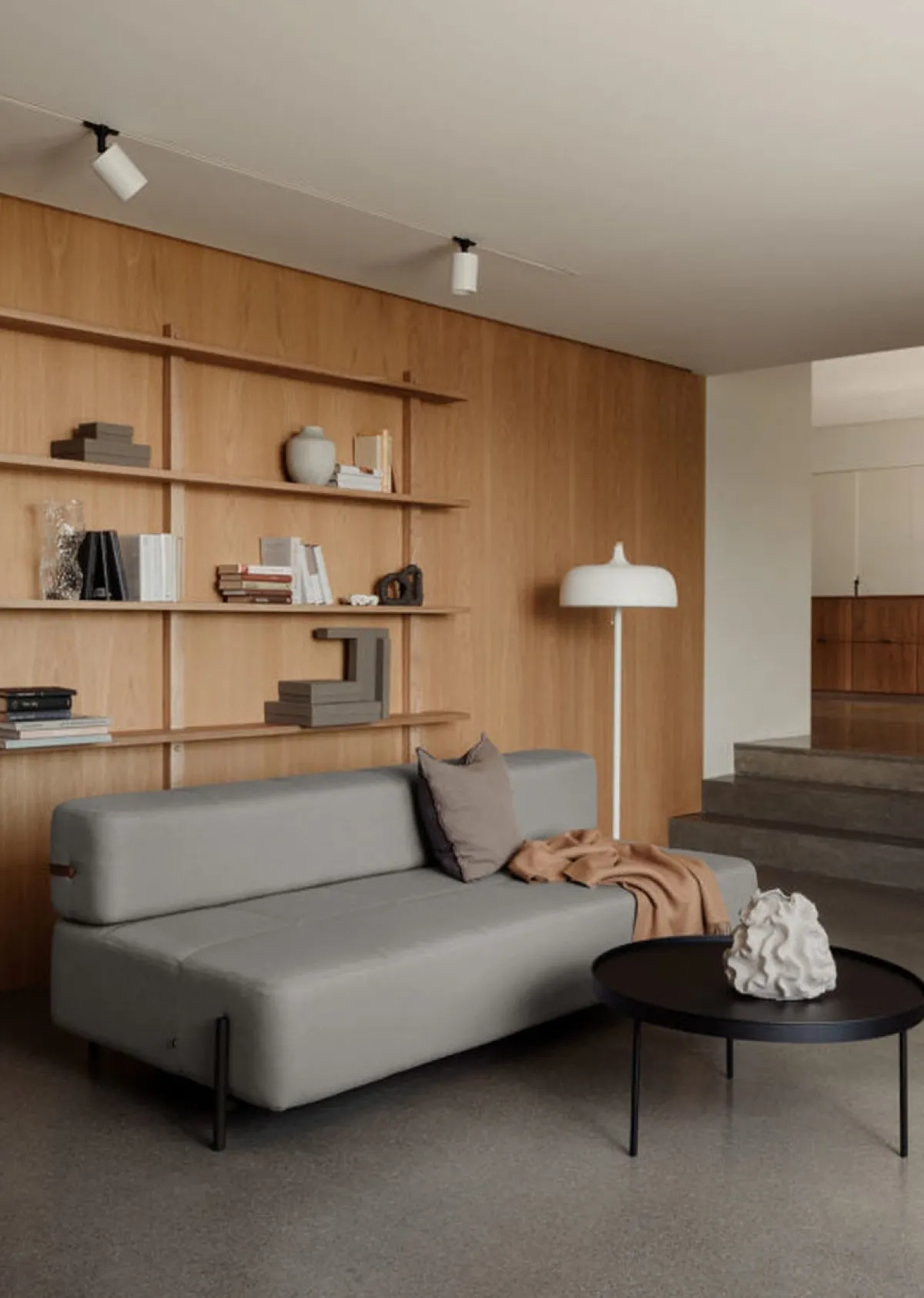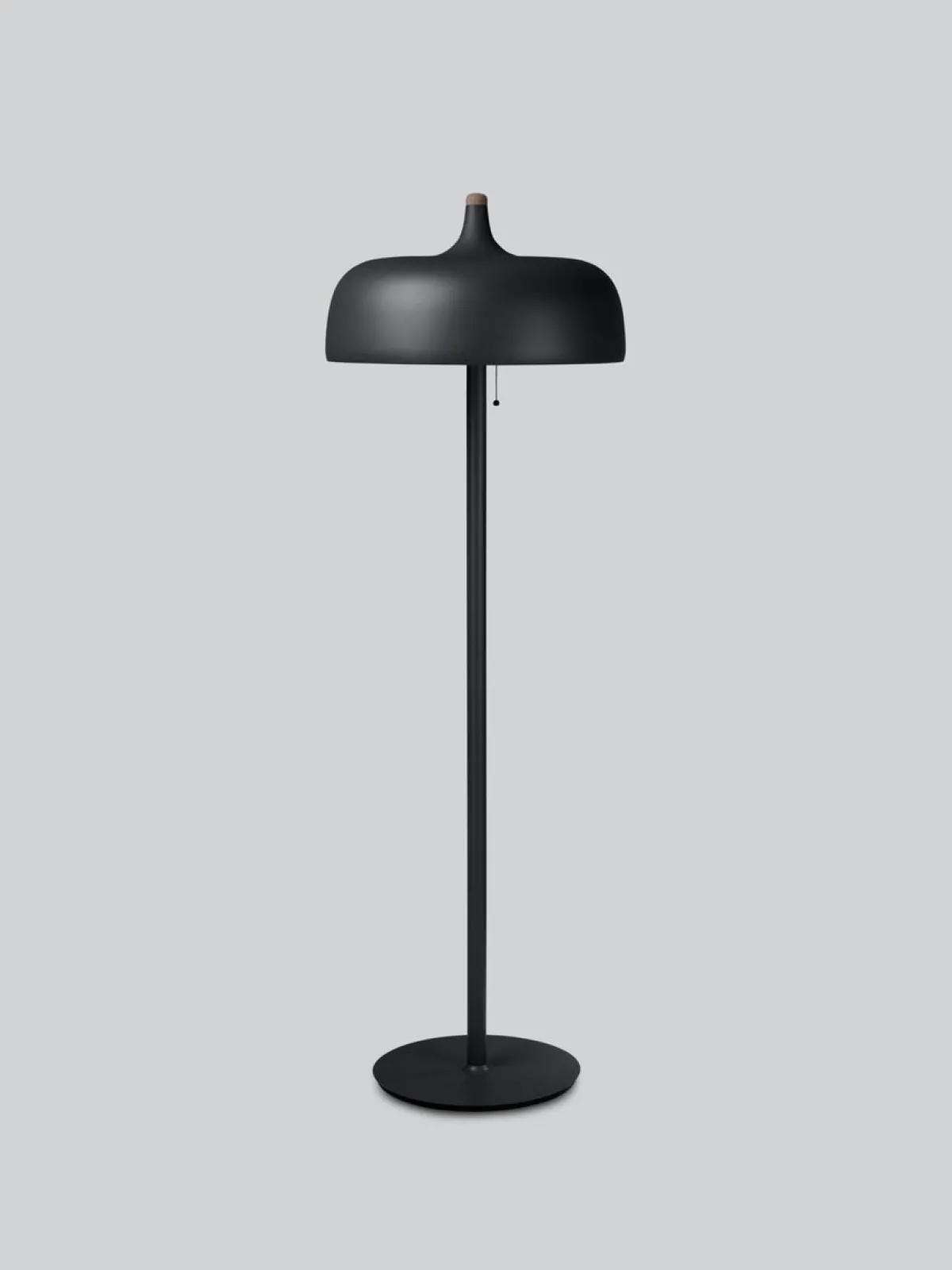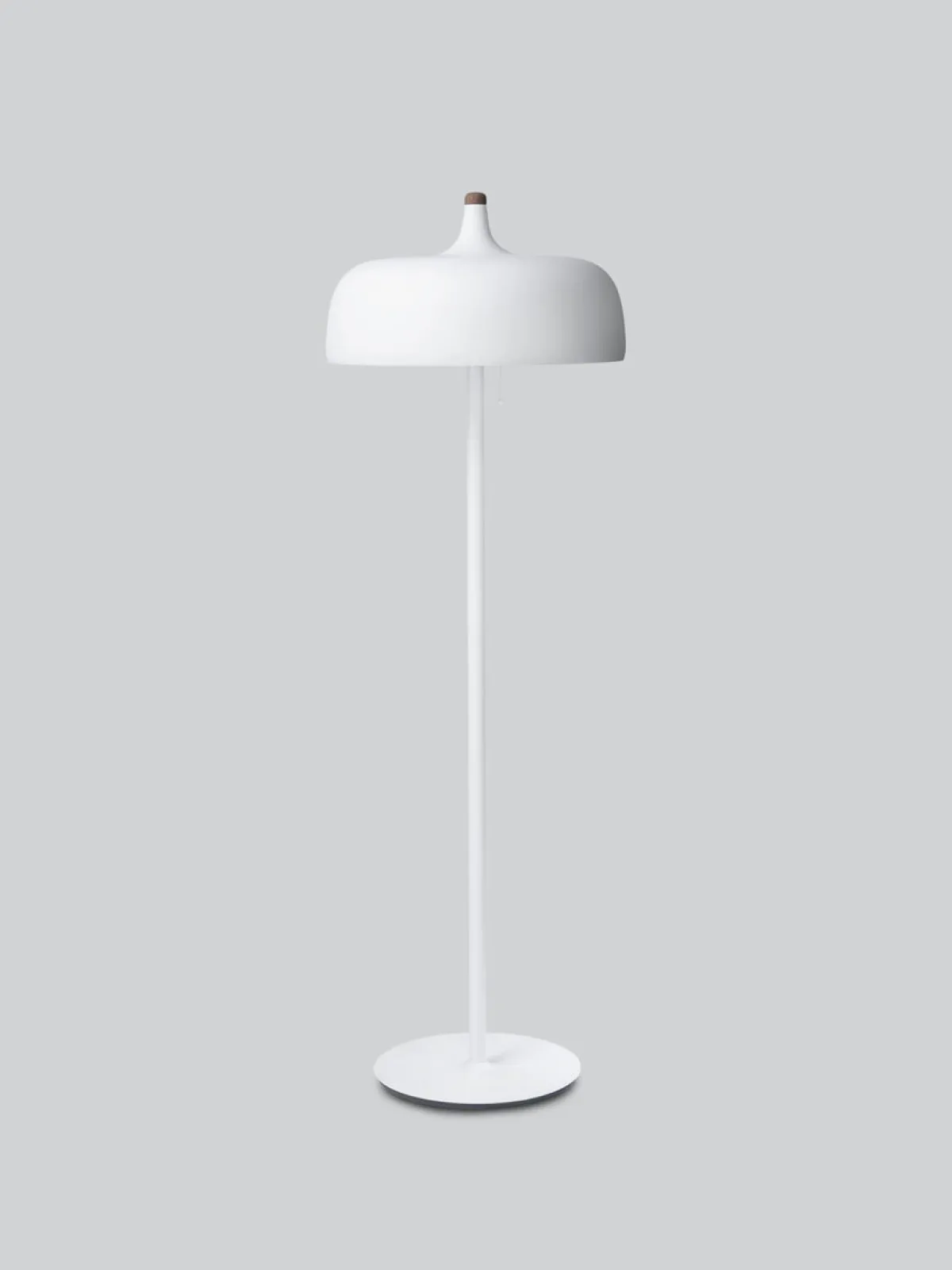 Acorn gulvlampe er tilgjengelig i hvit, mørkegrå og svart finish. Den har varme bøk- og valnøttdetaljer på aluminiumsskjermen, og en pen trekkbryter.