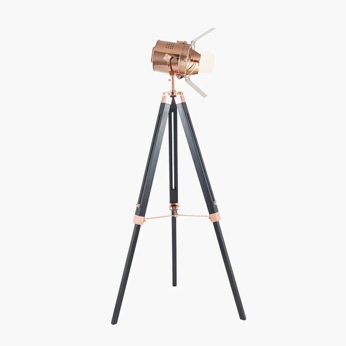Gulvlampe i sortlakkert treverk, med detaljer i kobbe