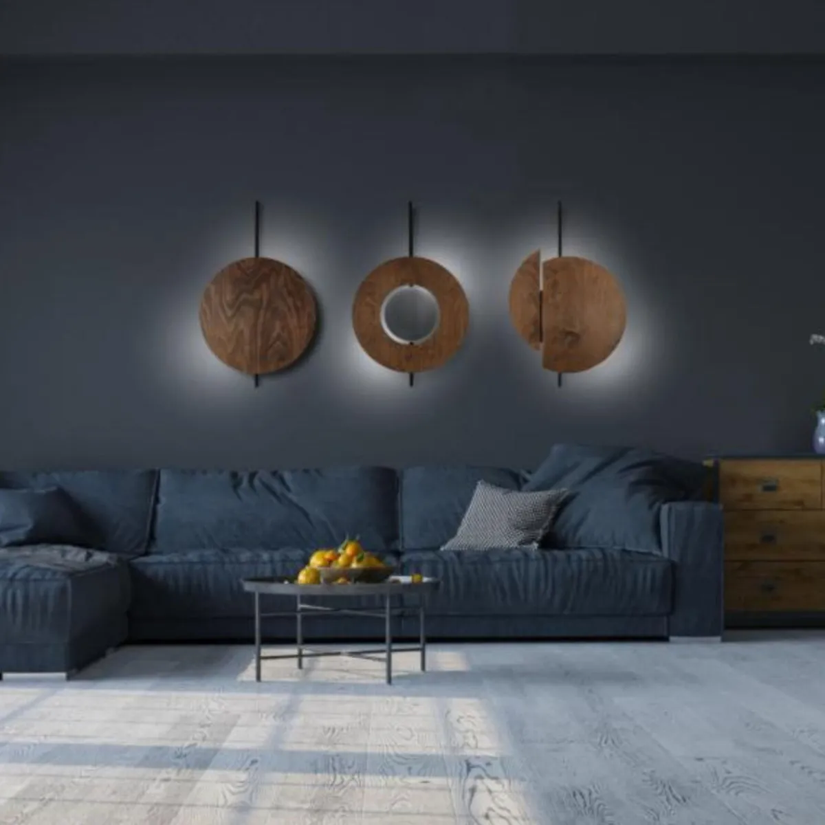 Sunset C Vegglampe består av en rund plate delt i to ulikt store deler utført i brunt treverk og plassert offset for hverandre