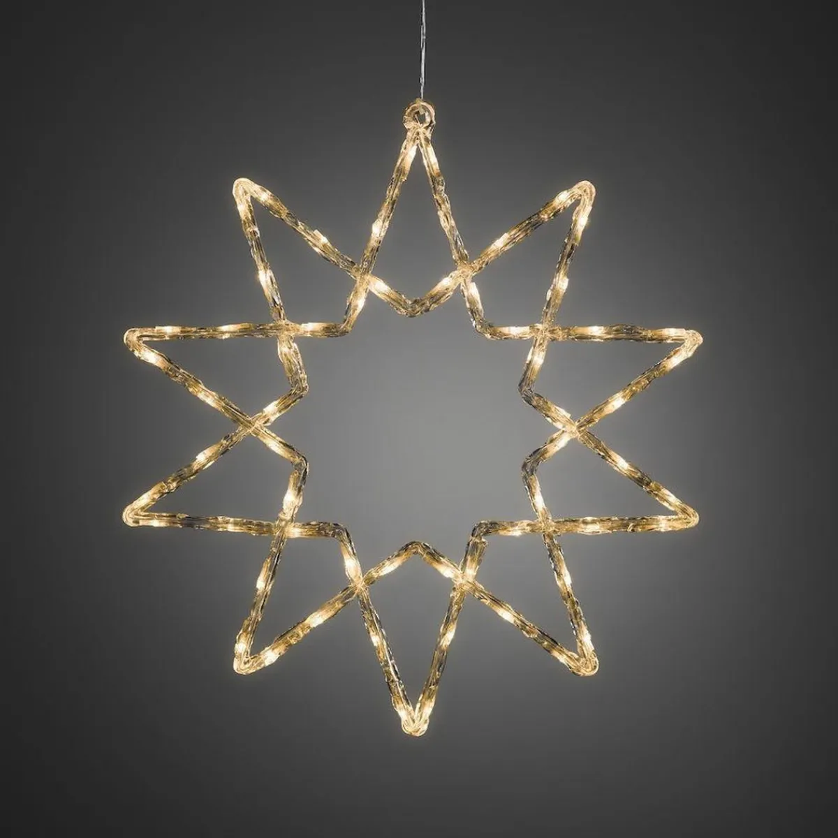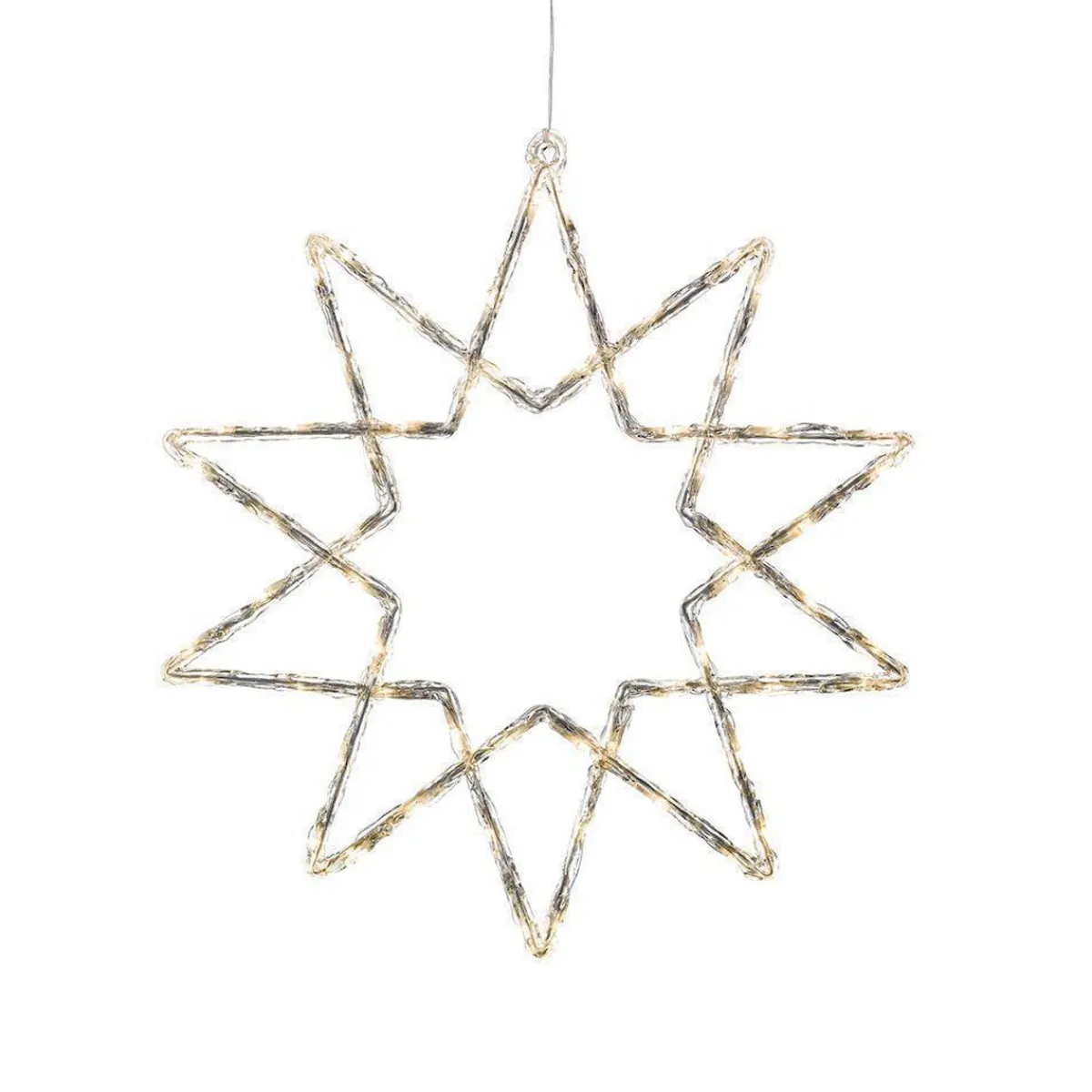 Stjerne med 60 varmhvite LED, 58 cm. Transparent kabel.