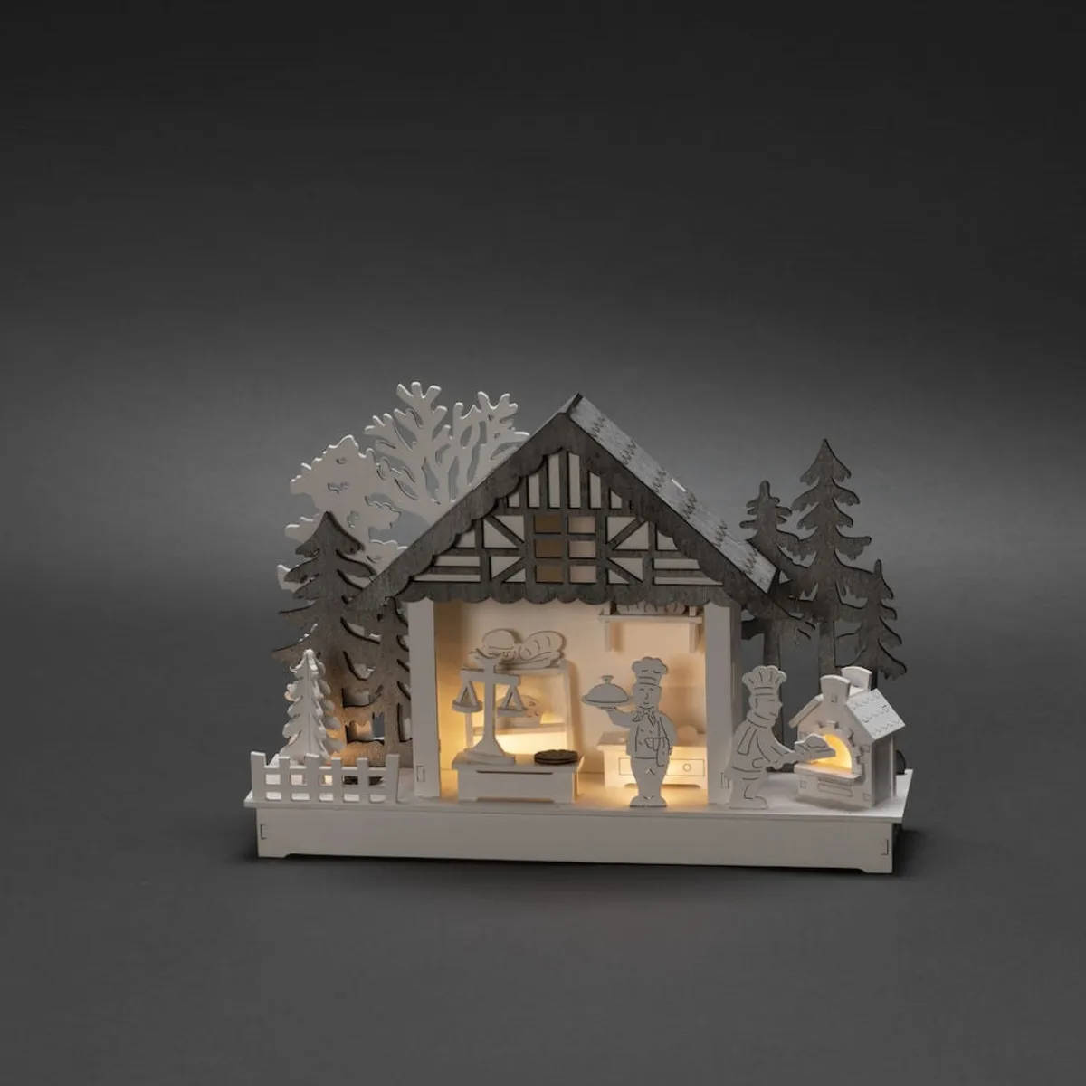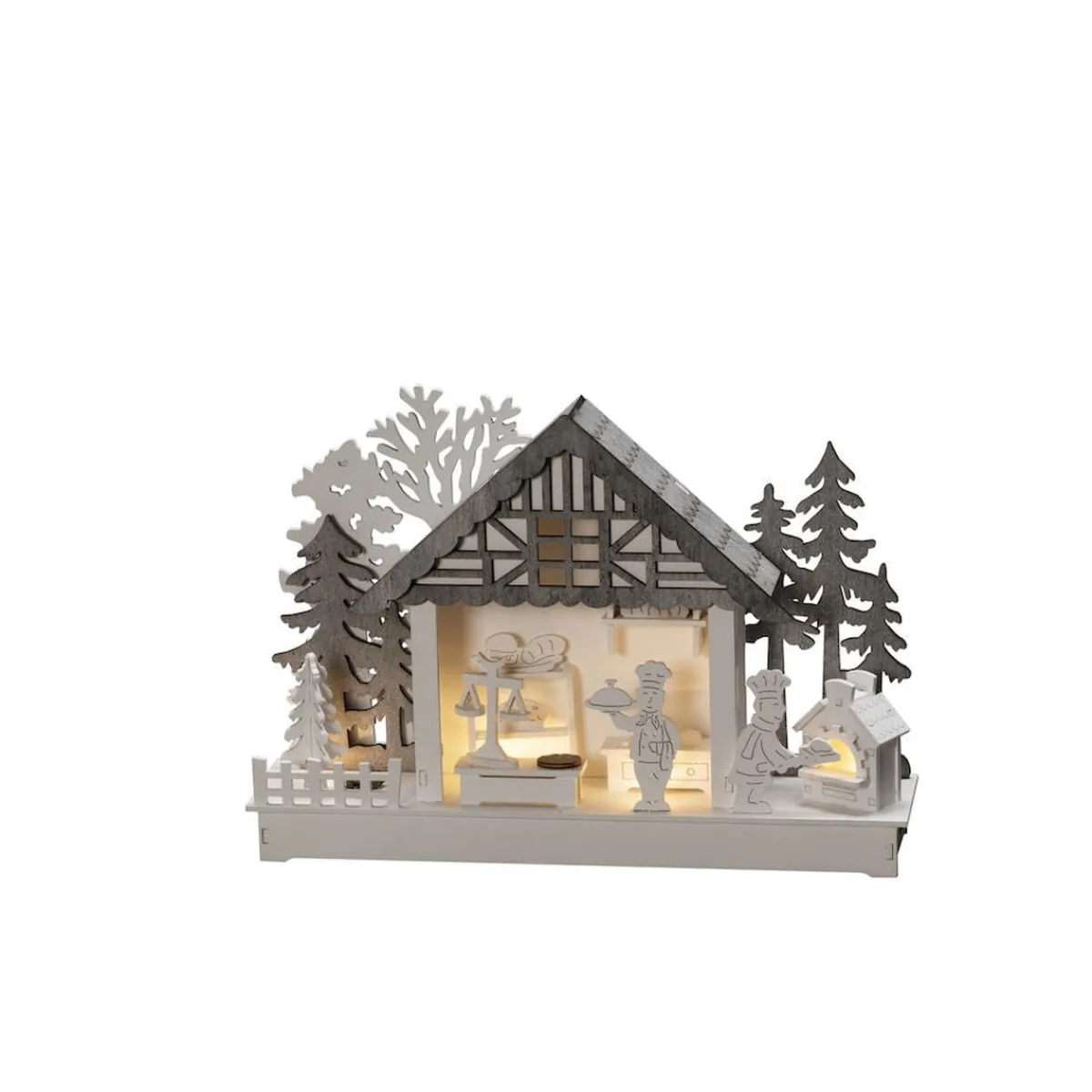 En søt juleby med bakere som gjør klar julebaksten med hvitt/grått treverk.