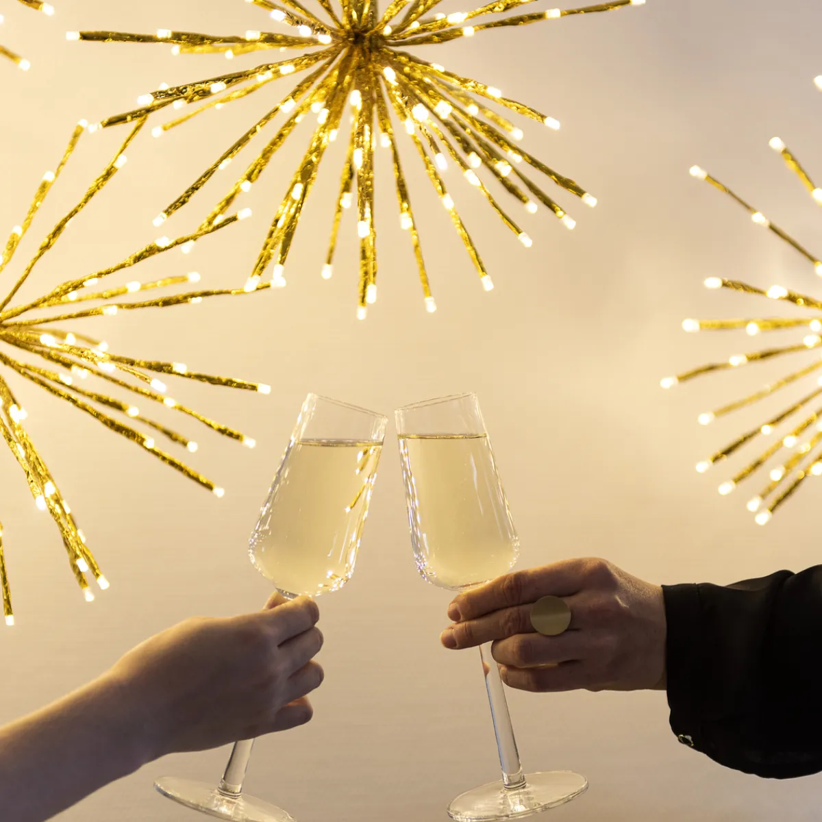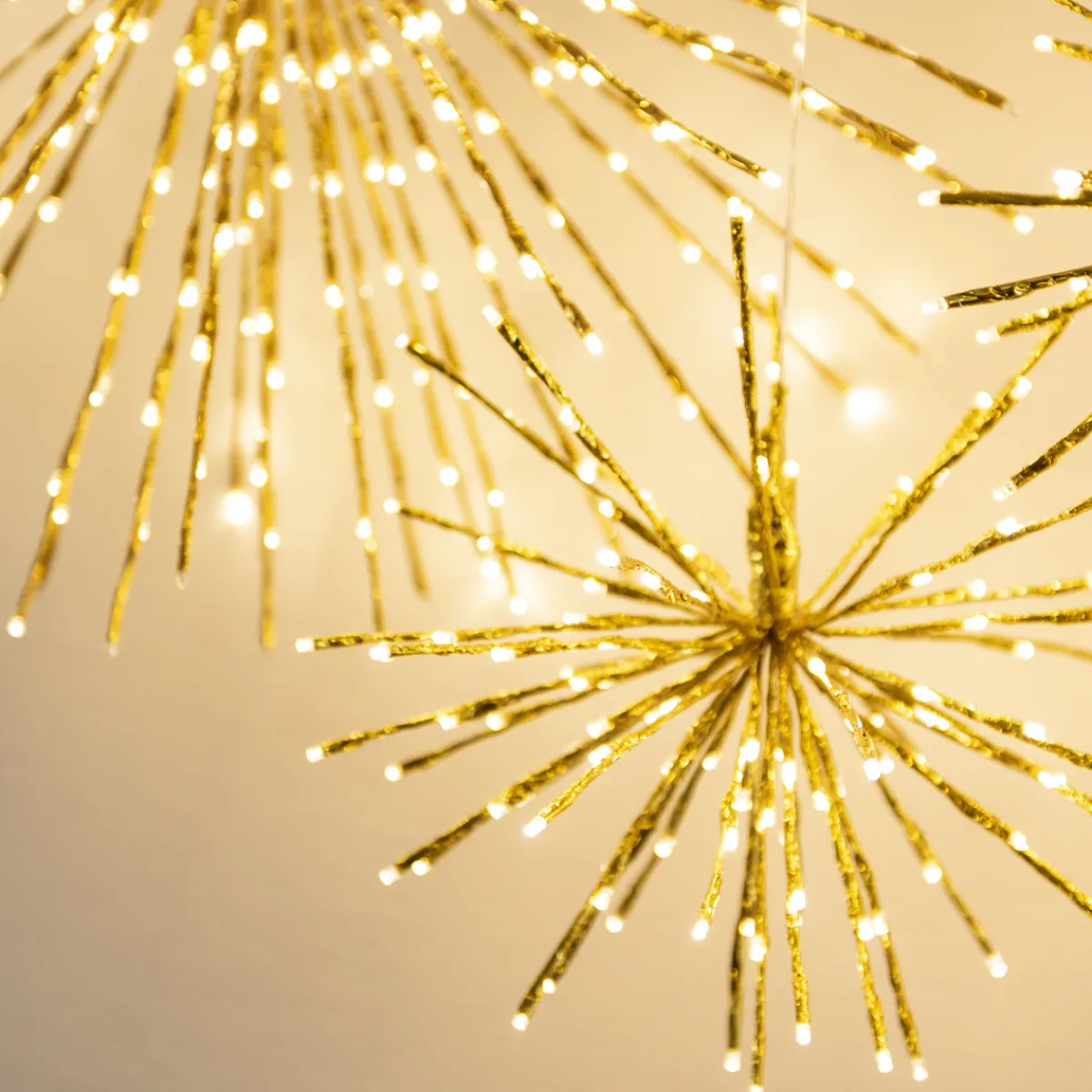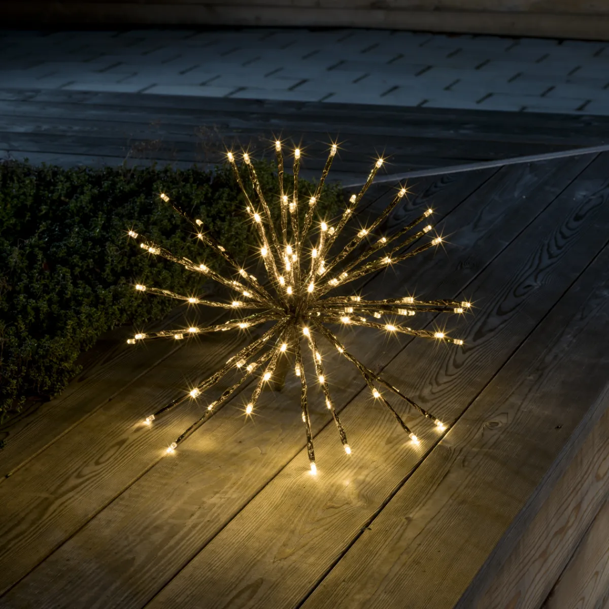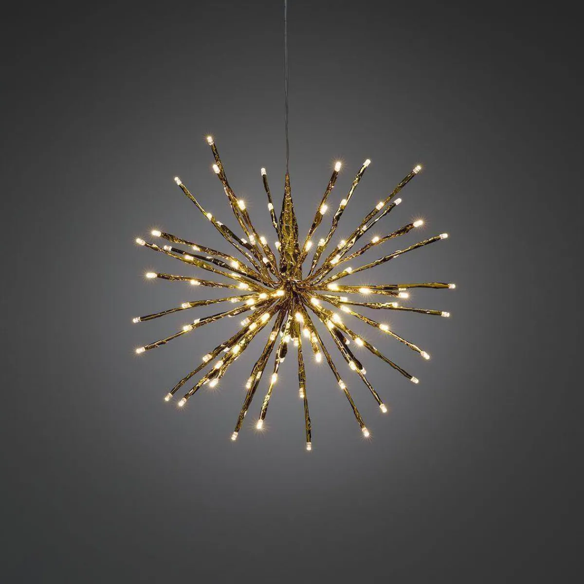 Stor lysball i gull med 120 varmhvite LED. Ballen er 40 cm i diameter. Ballen kommer flatpakket og foldes ut til bruk.