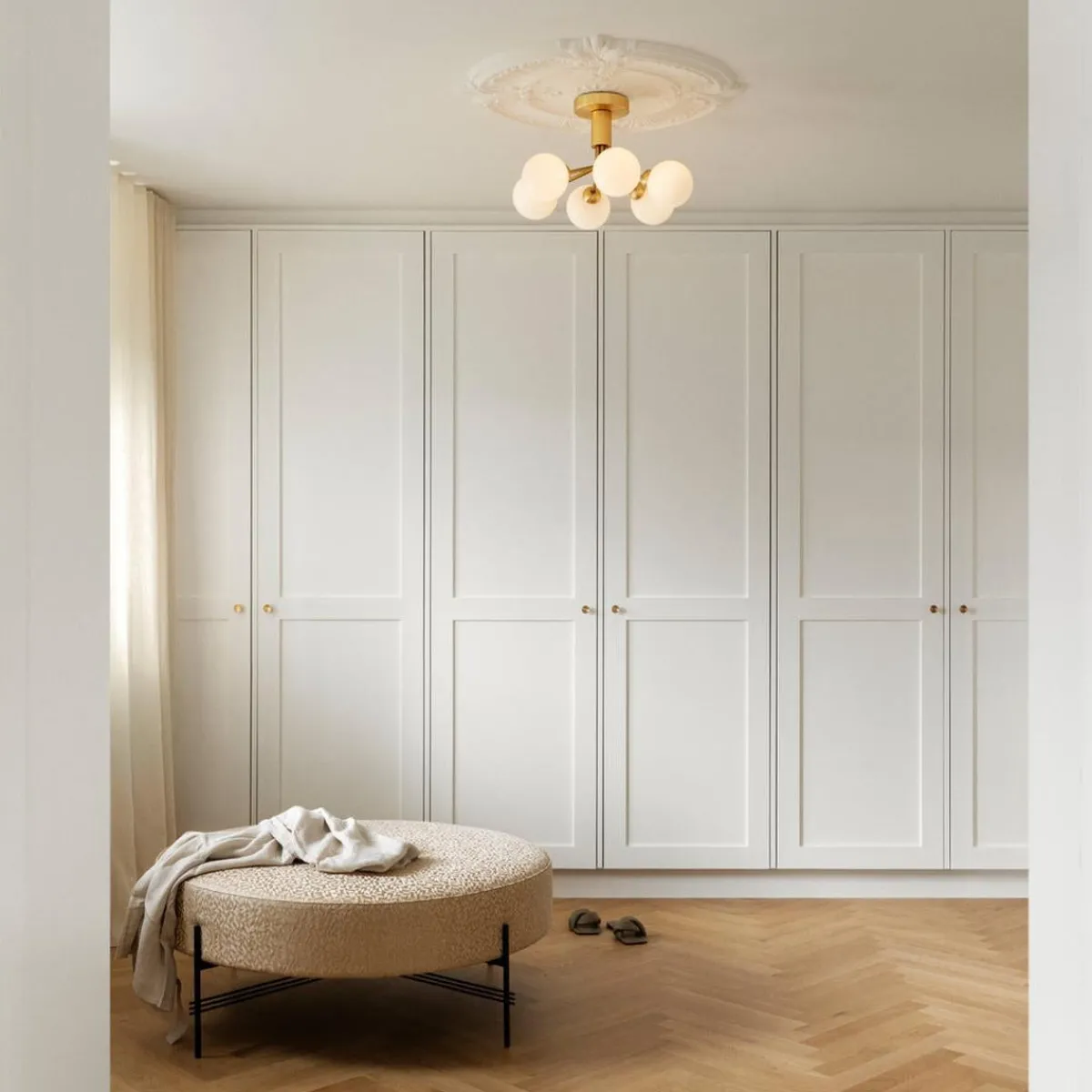Med inspirasjon fra blomster bretter Apiales 6 Ceiling ut sine 6 metallarmer i børstet messing som blomsterstilker fra en spesialprodusert baldakin og støtter 6 munnblåste glasskuler i opalhvitt.