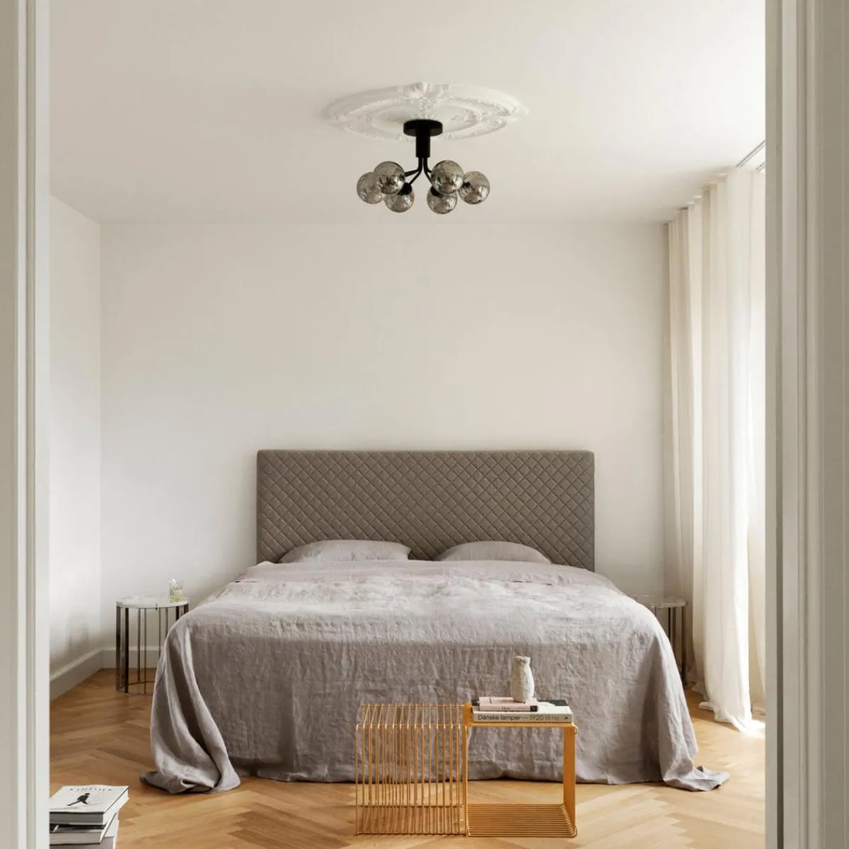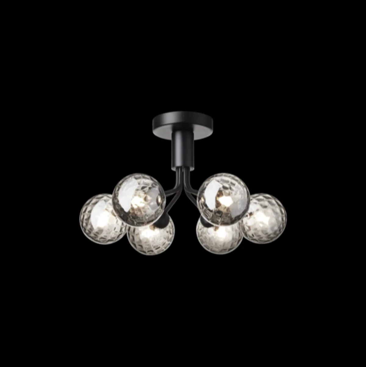 Med inspirasjon fra blomster bretter Apiales 6 Ceiling ut sine 6 metallarmer i vakker satengsort farge som blomsterstilker fra en spesialprodusert baldakin og støtter 6 munnblåste glasskuler i optic smoke glass.