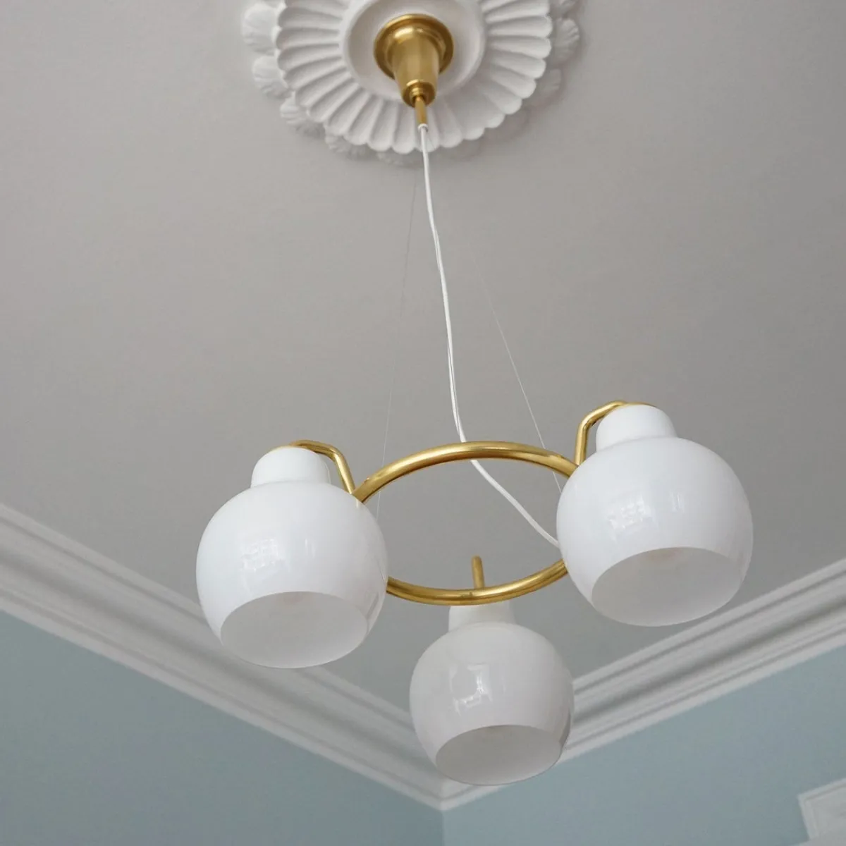 - Farge: Blankt, munnblåst, hvitt opalt glass. Satengpolert messing, ubehandlet.