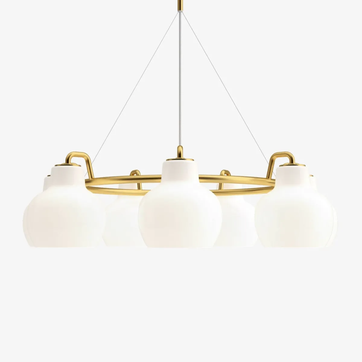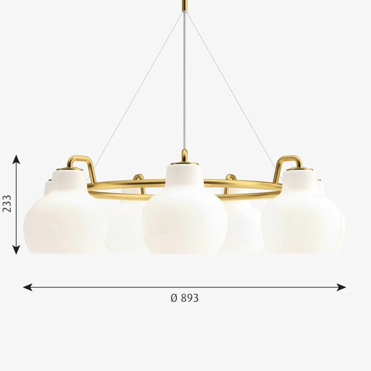 - Materiale: Skjermer: Munnblåst, 3-lags opalt glass. Wirer til Ring Crown: Rustfritt stål. Ramme og baldakin i ubehandlet messing, utvikler patina over tid.