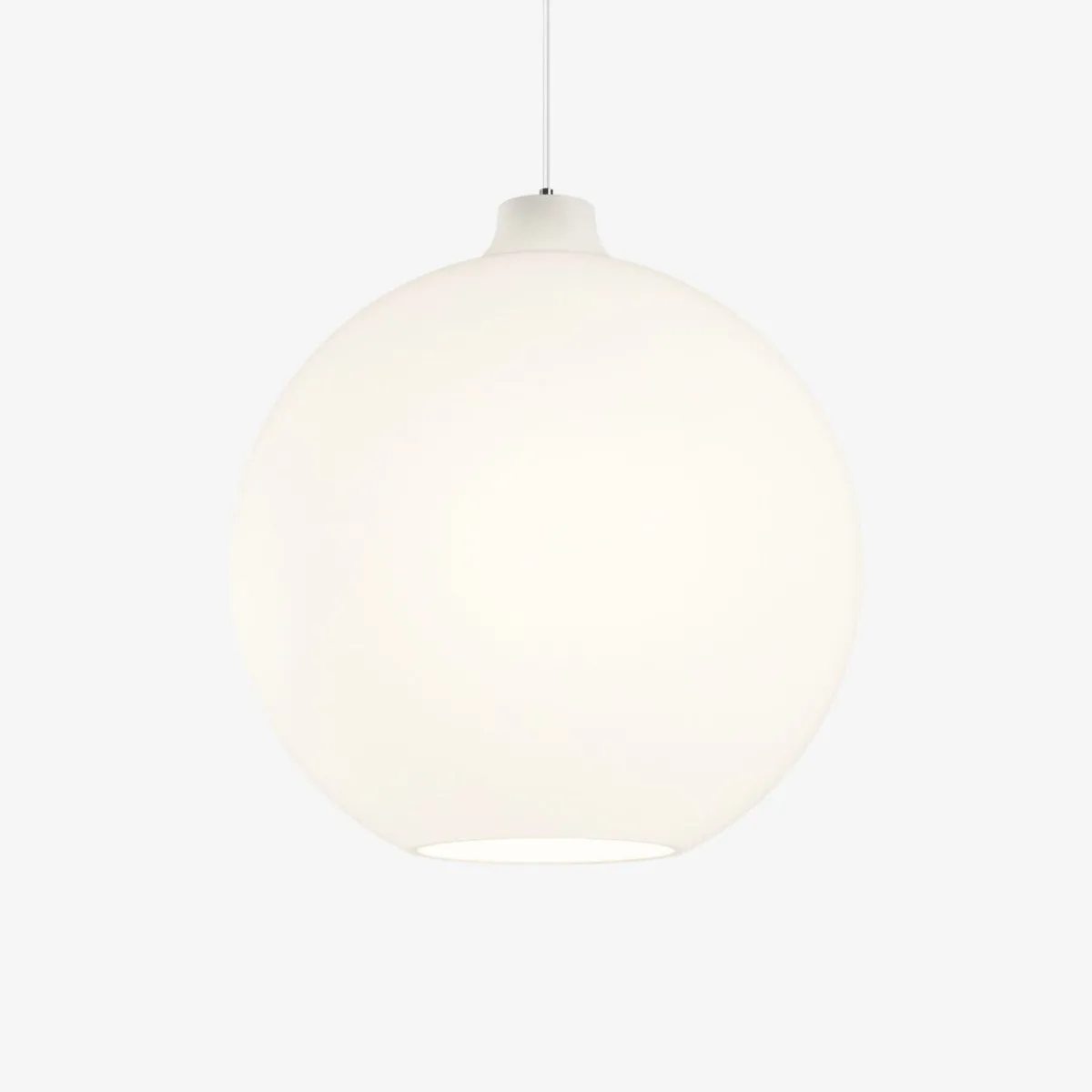 - Materiale: Munnblåst, matt hvitt opalt glass. Pendelrør: Børstet stål.