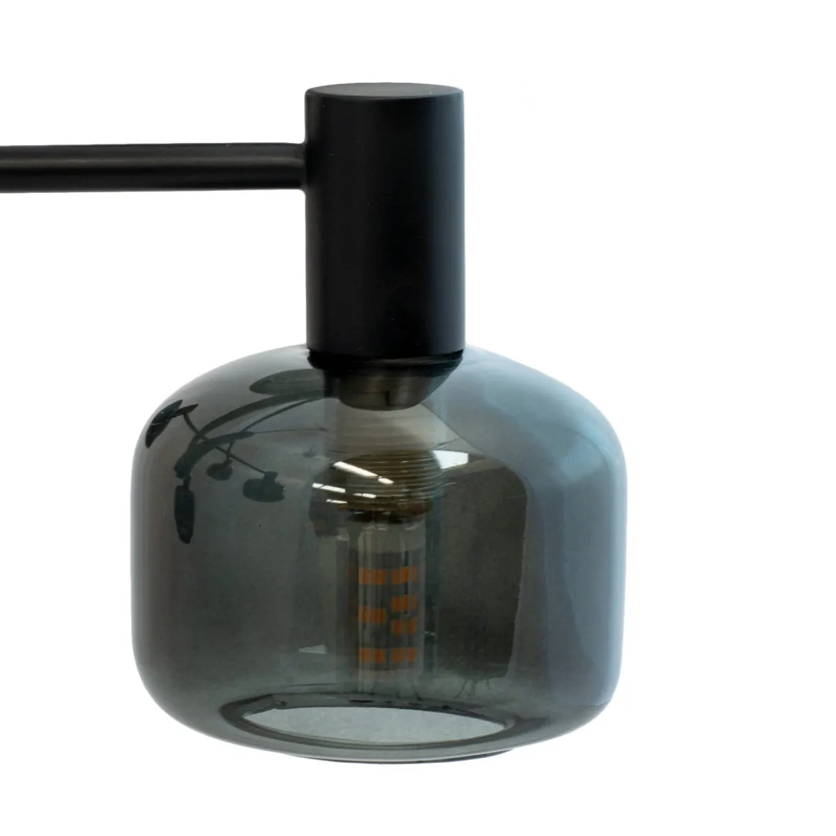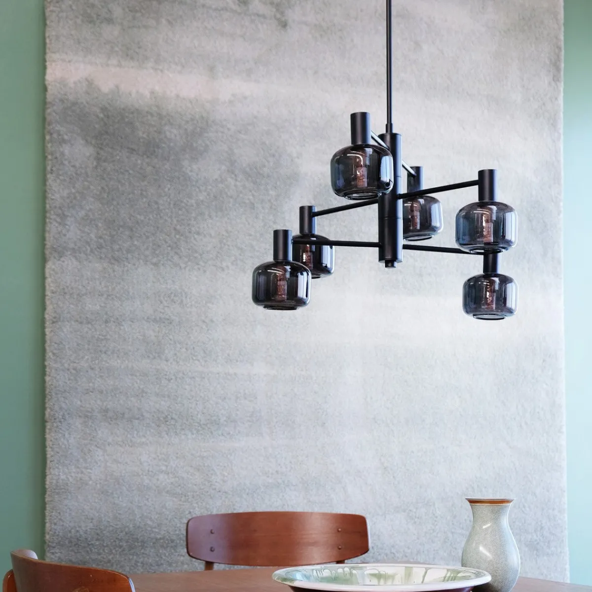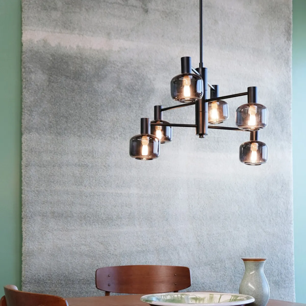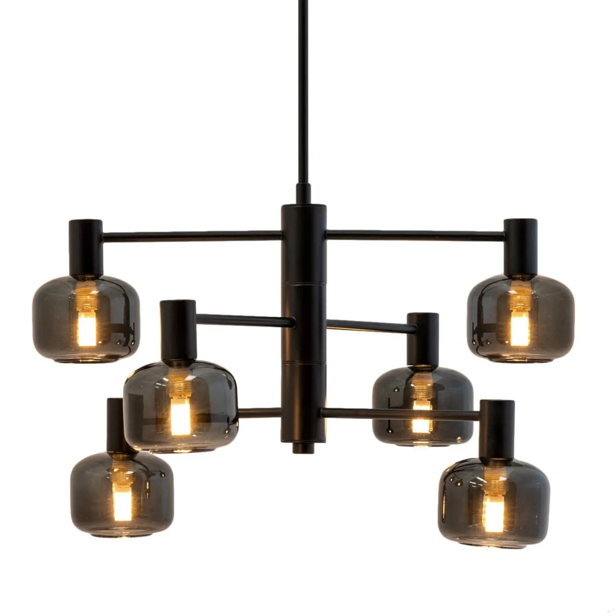 Oppnå den perfekte balansen mellom form og funksjon med vår Arp-lysekrone, som har 6 vakre glasskupler i røkt glass og en elegant svart oppheng.