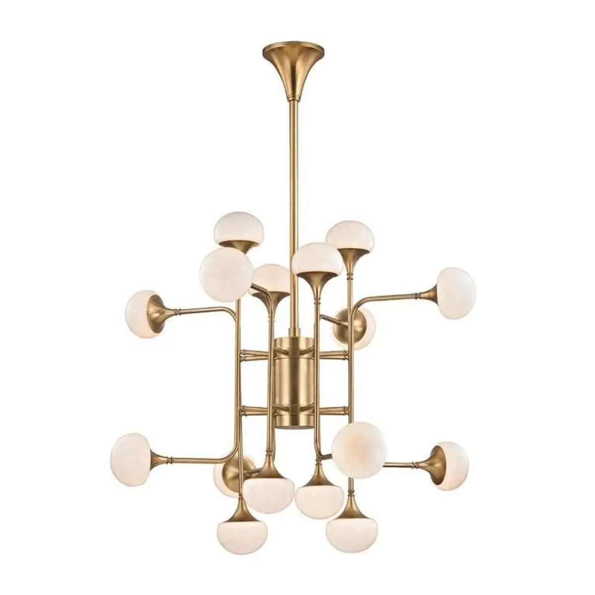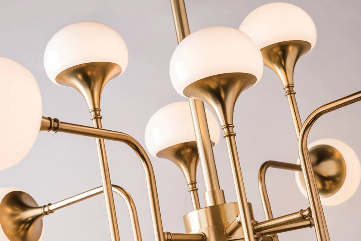 Fleming lysekrone fra Hudson Valley er en lampe med wow-faktor! Heng den over spisebordet, over salongbordet, på kjøkkenet, på soverommet eller midt i rommet om høyden tillater det. Lampen har en fin messingfinish, 8 kupler i opalhvitt glass og sørger for godt lys til rommet.