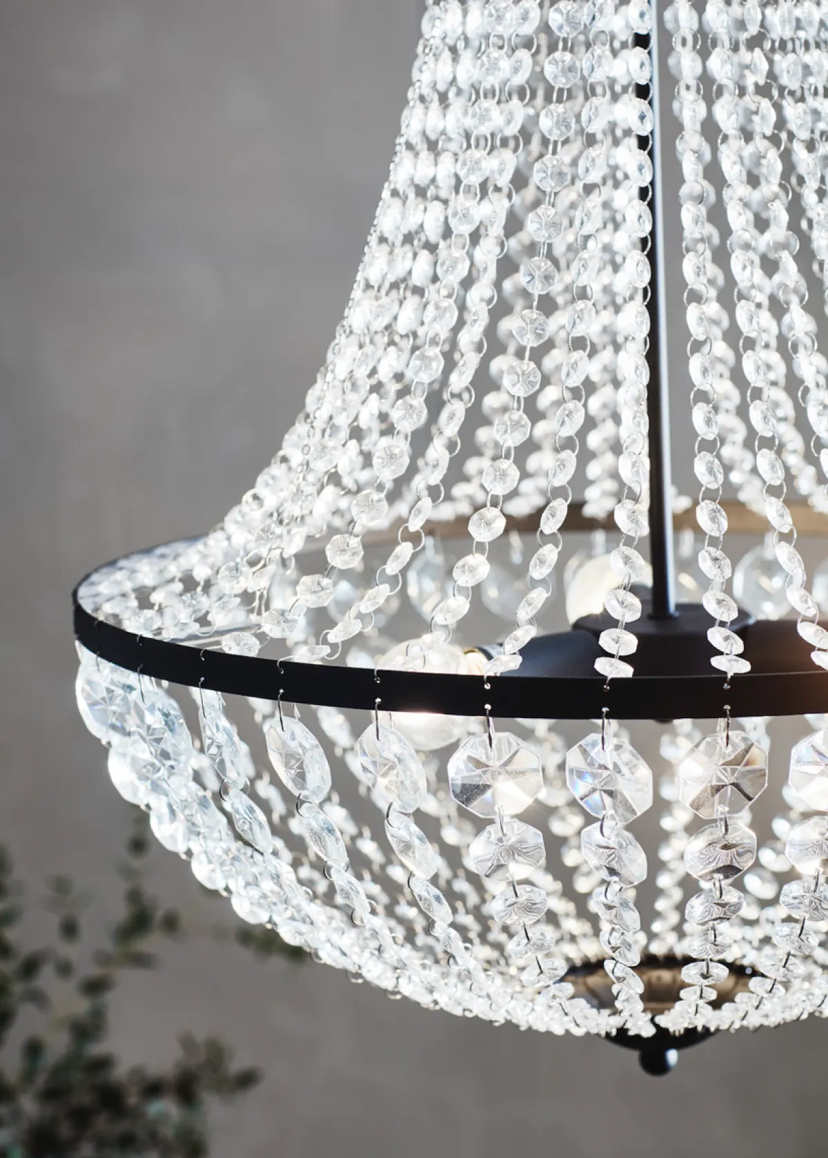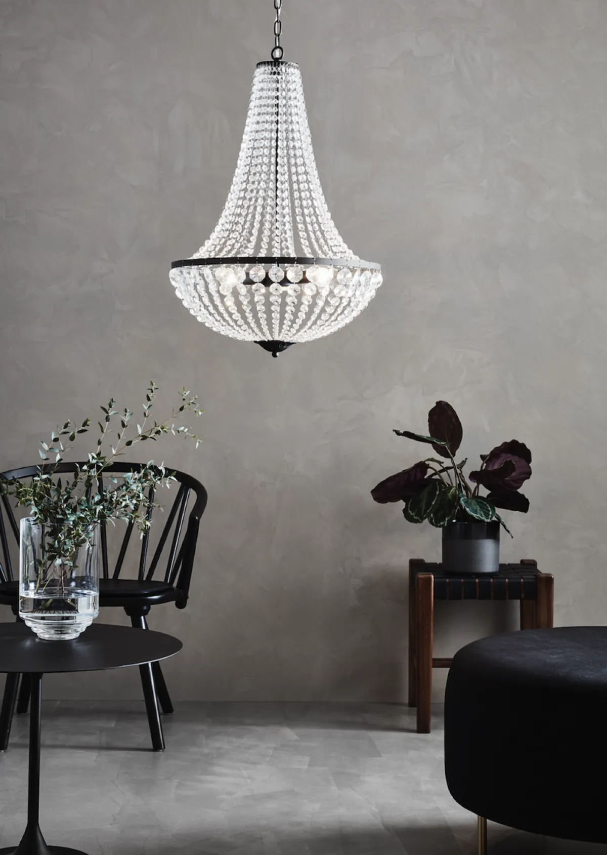 De svarte detaljene fremhever de klare prismene som skaper et lite spill i lysekronen.