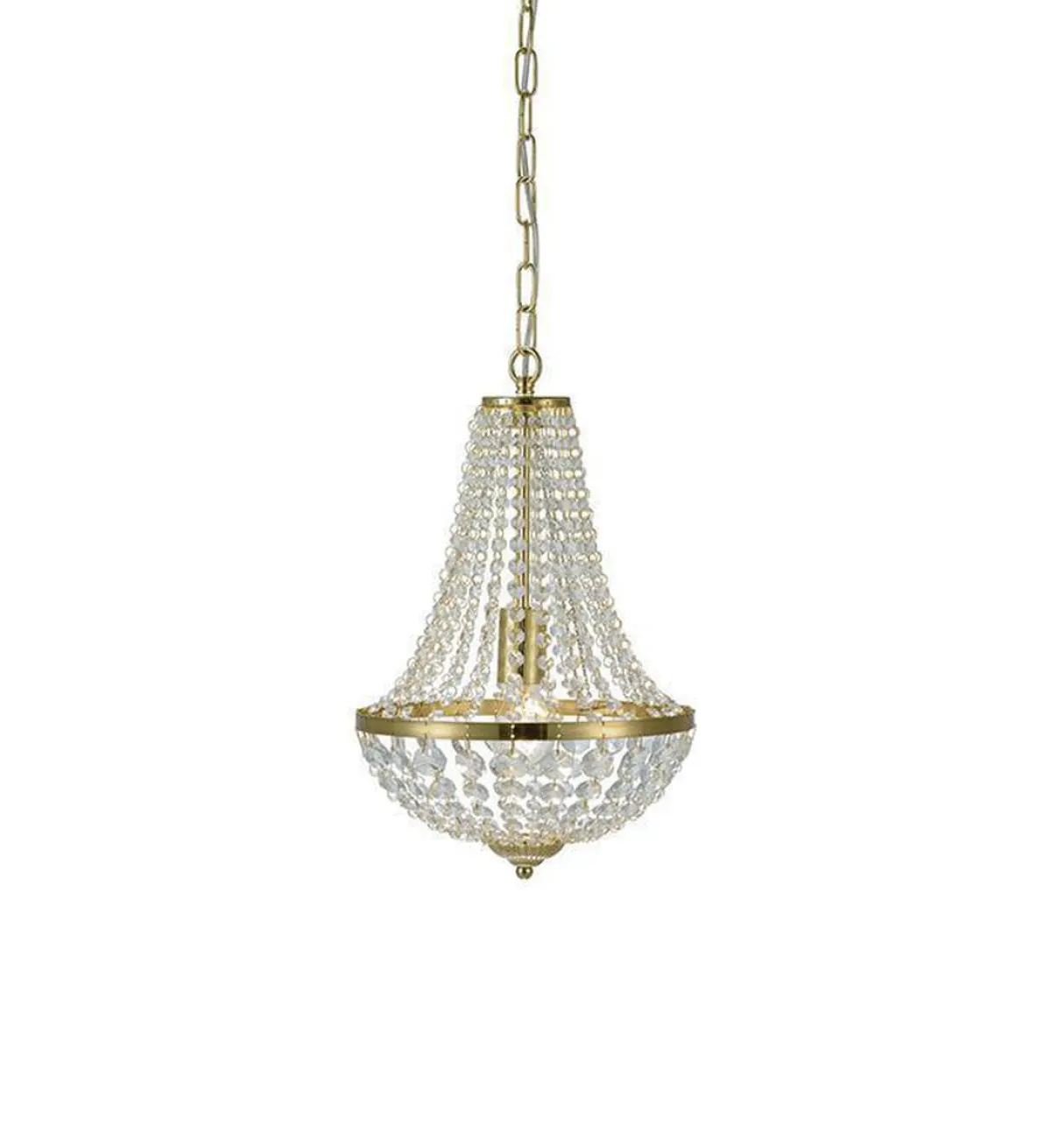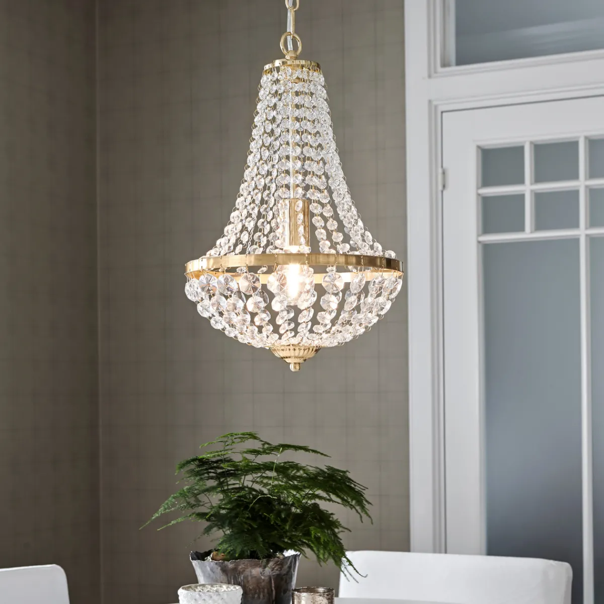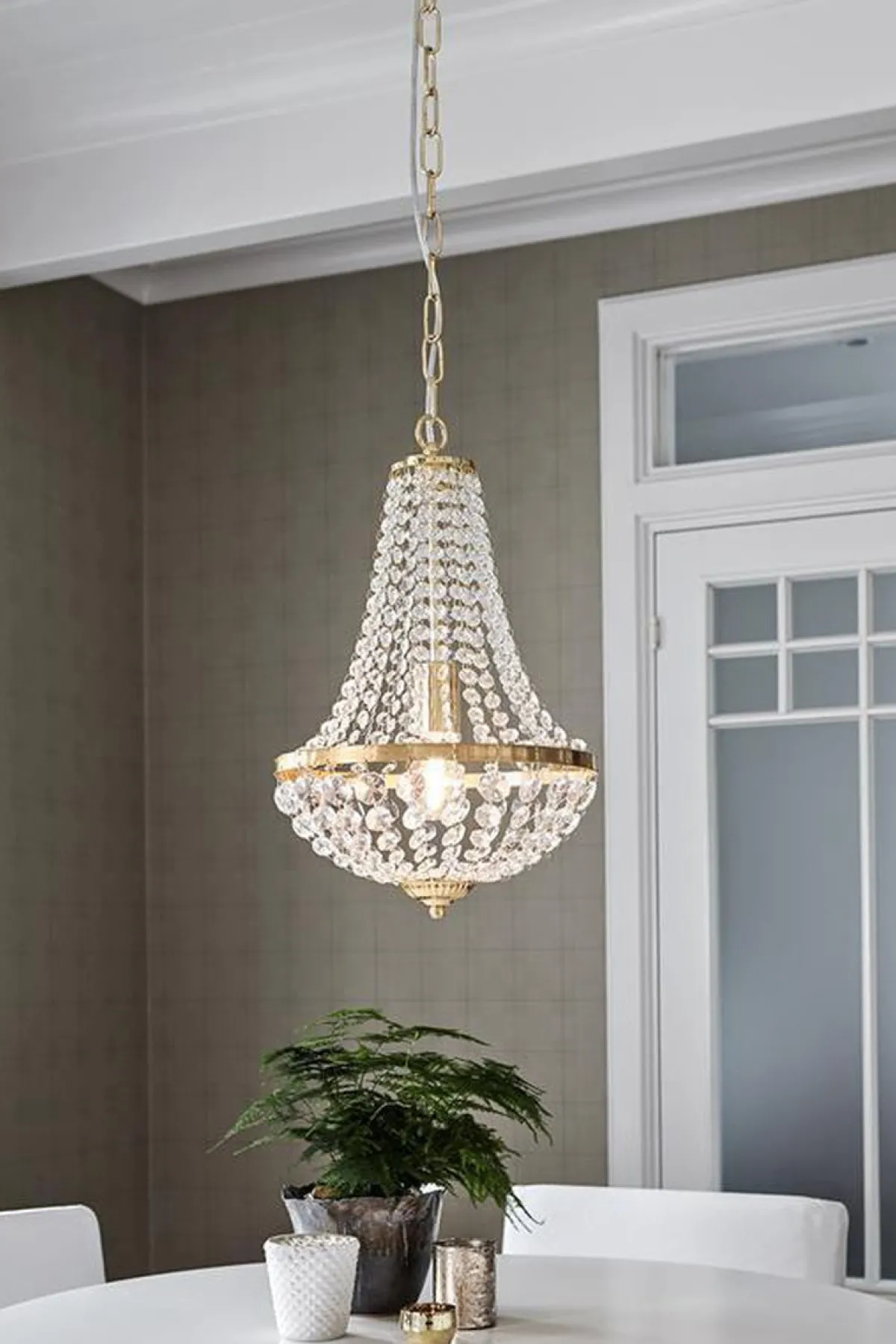 Nydelig krystallkrone i messingfarget metall, med glassprismer.