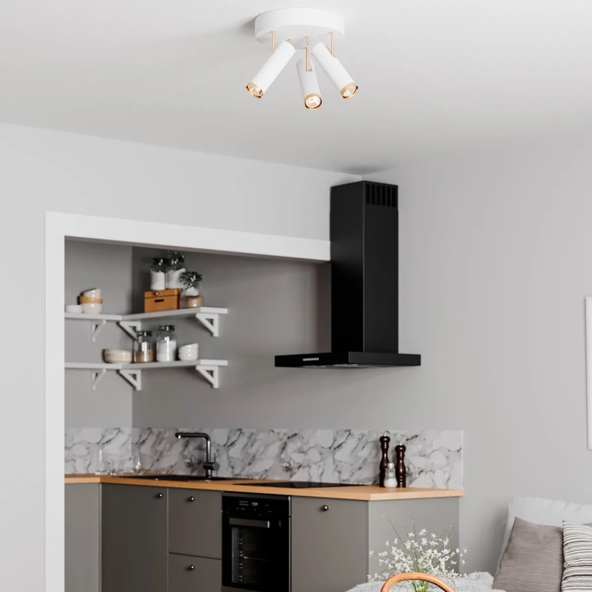 En moderne spotlight med tre bevegelige spoter i sort og gullfarget metall som passer fint i entreen, kjøkkenet og stuen. Takspoten gir et luksuriøst sett med lamper som du kan justere dit du vil for å skape et bestemt lysskinn mot forskjellige gjenstander. Når du kjøper takspoten, bør du også kjøpe til tre lyskilder med GU10-sokkel. Puls-takspot er enkel å montere, sitter stødig på plass og gir et effektivt og behagelig lys.
