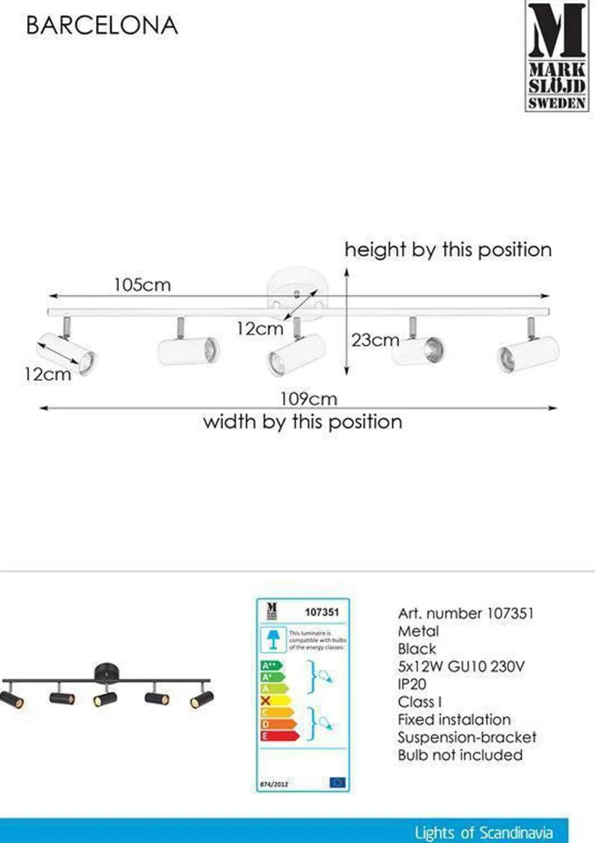 Barcelona-spottskinne er en enkel og moderne taklampe med 5 justerbare lampehoder, fra Markslöjd. Du behøver 5 stk lyspærer med GU10-sokkel til lampen.