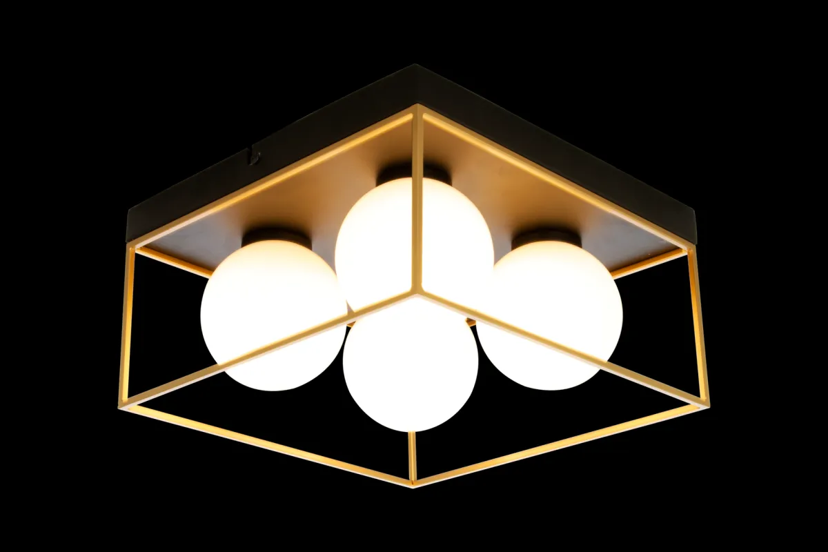 Astro taklampe med 4 opalhvite glasskupler innrammet i gulldetaljer på svart takplate. Lampens hovedmateriale er metall/glass. Wattstyrke maks 4 x 20W. Lyspærer ikke inkludert. Lampen monteres på bøyleoppheng/brakett og tilkobles med koblingsklemme.