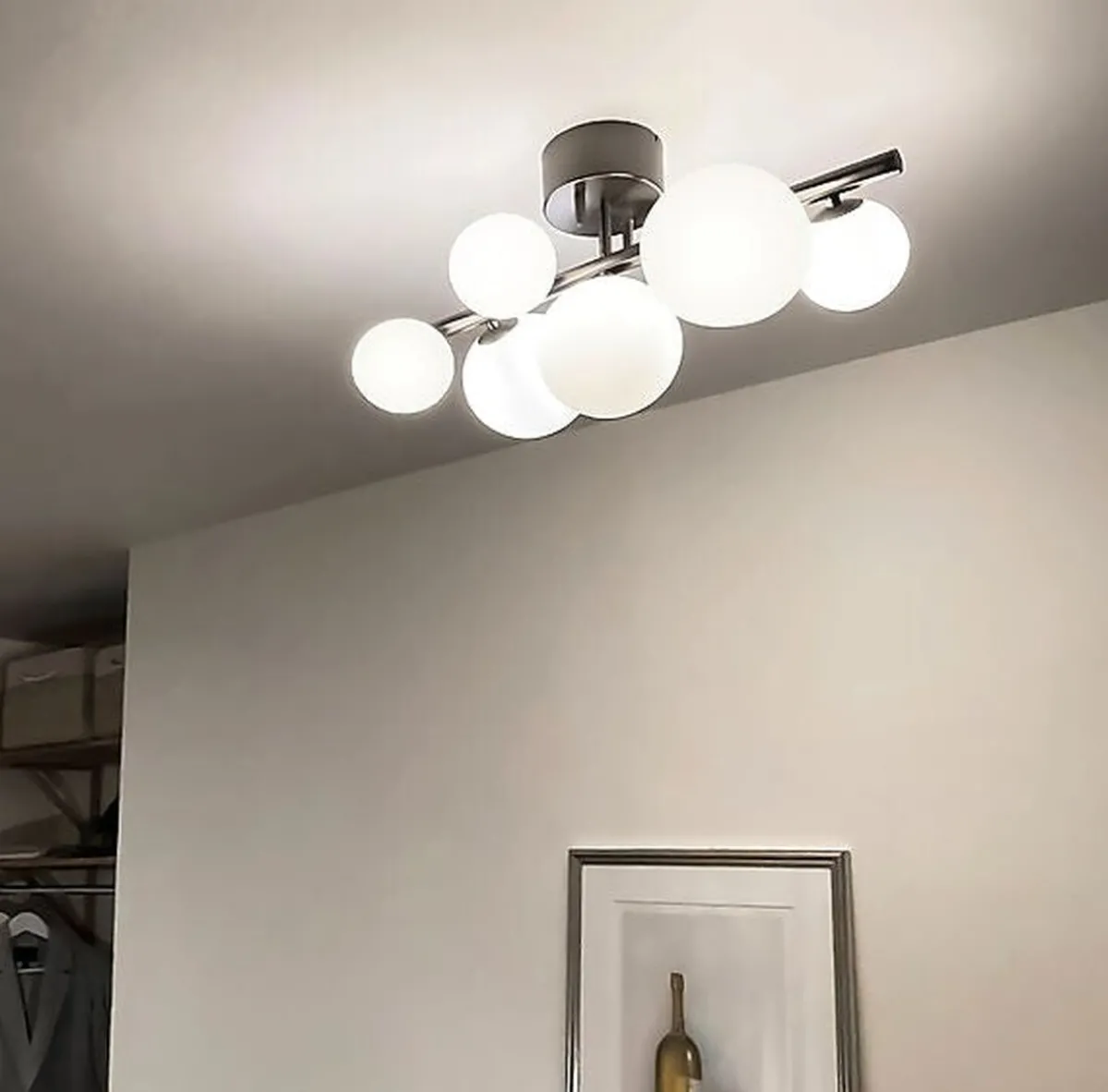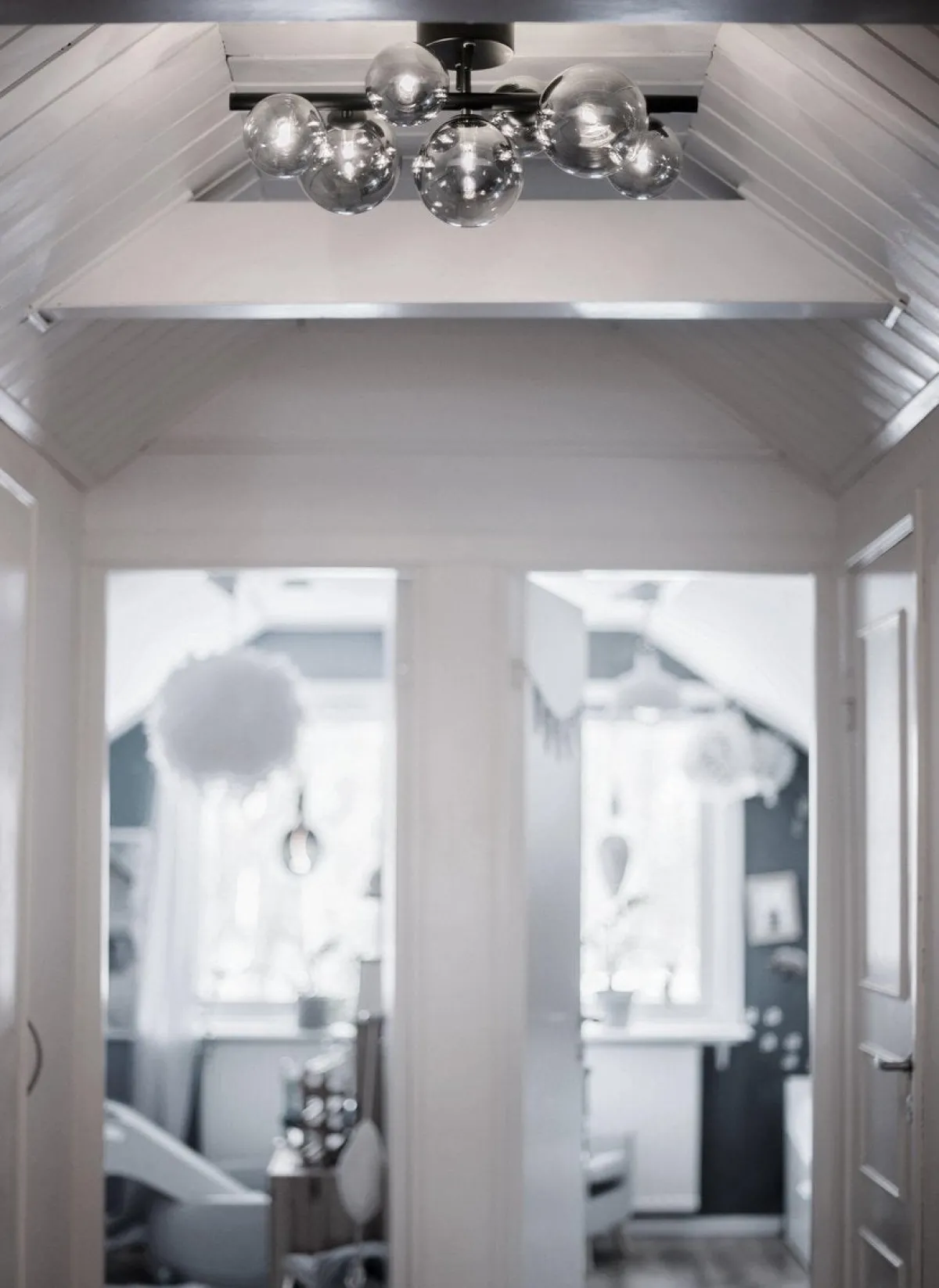Molekyl er en nydelig og moderne taklampe med opalhvite glasskuler. Du behøver 7 stk lyspærer med G9-sokkel til lampen.