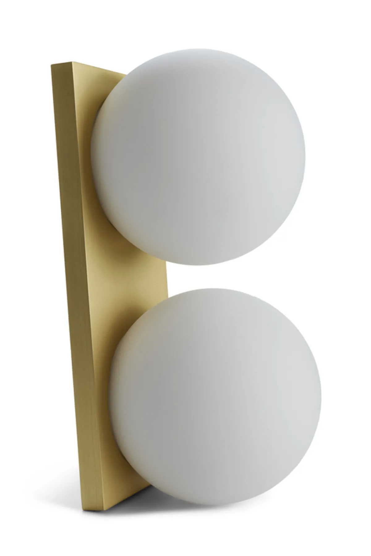 De to sfæriske glasslampene er montert på en aluminiumsfot, som gir en elegant kontrast til det rolige glasset. Basen kan velges i titan eller messing, som hver gir et unikt uttrykk.