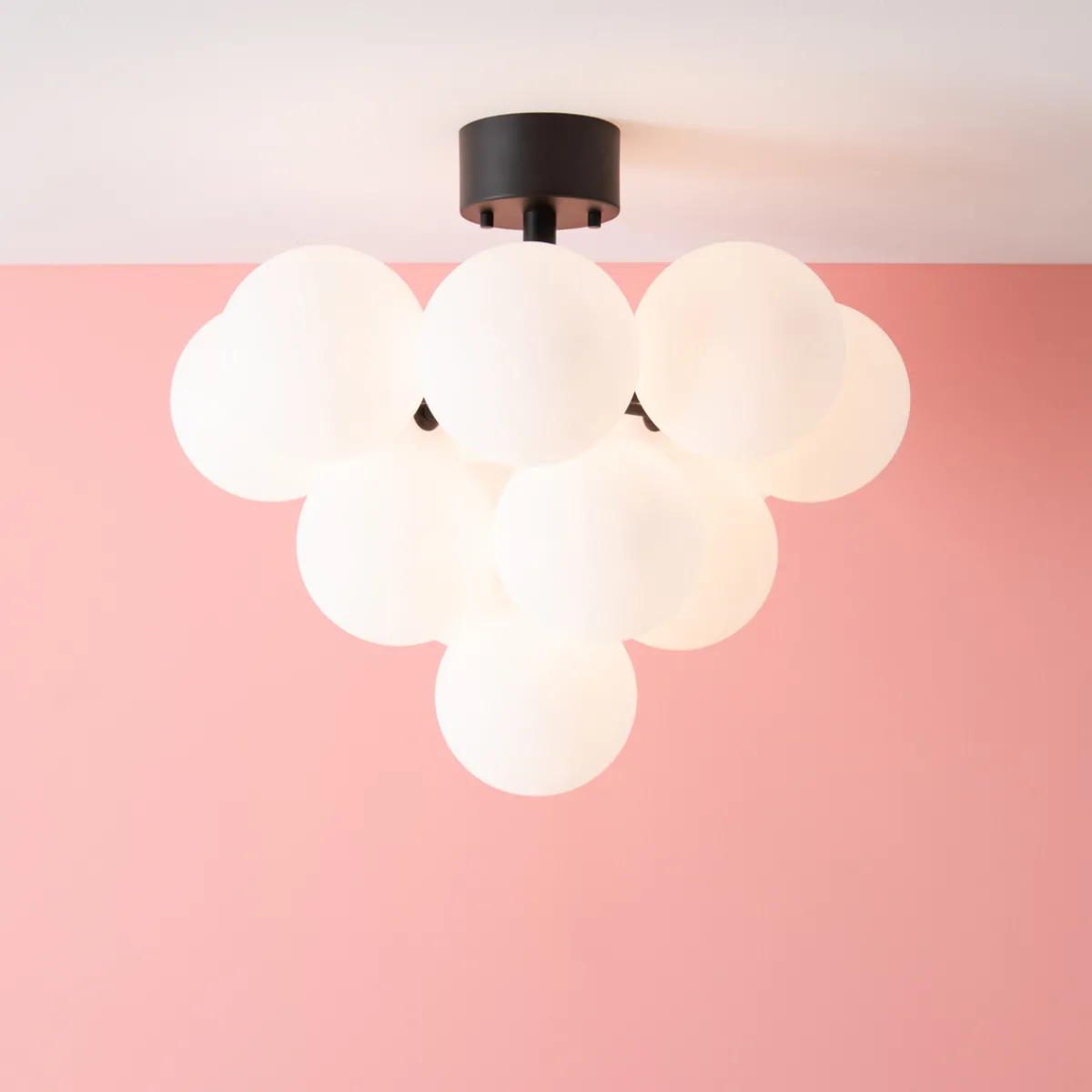 Merlot er en nydelig og dekorativ taklampe med glasskupler i opalhvitt glass. De opalhvite glasskuplene gir et jevnt og behagelig lys. Du behøver 13 stk lyspærer med G9-sokkel til lampen.