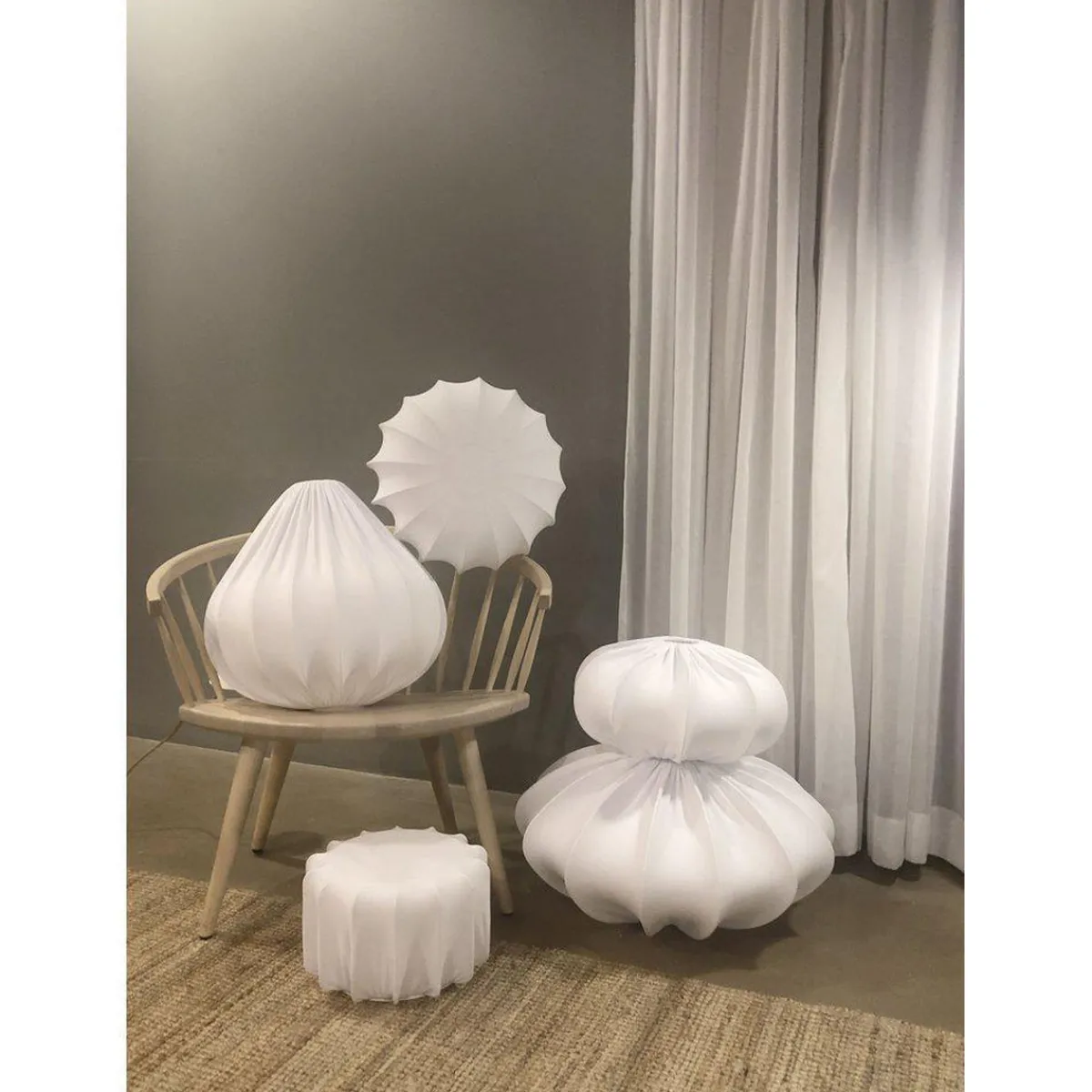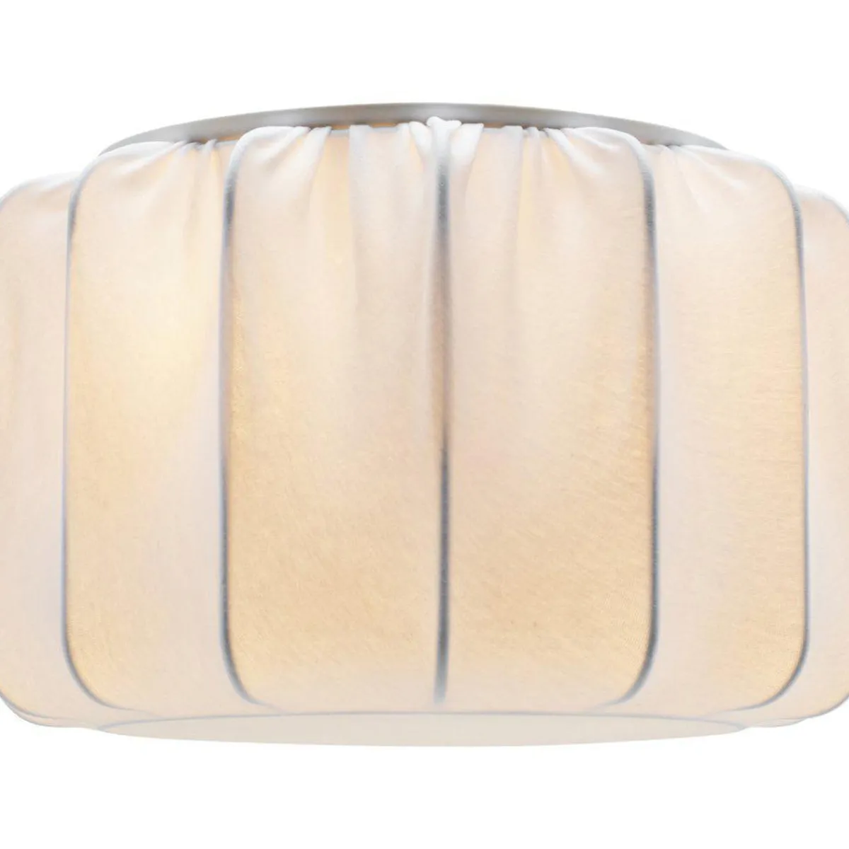 Iris plafond er en del av en serie skjermer i forskjellige størrelser og former polstret med hvitt jerseystoff. Skjermens diameter er 30 cm og høyden 21 cm. Egnet for mellomrom med både lavere og høyere tak. Leveres med takfeste for krokoppheng og 3 E27 pæreholdere.