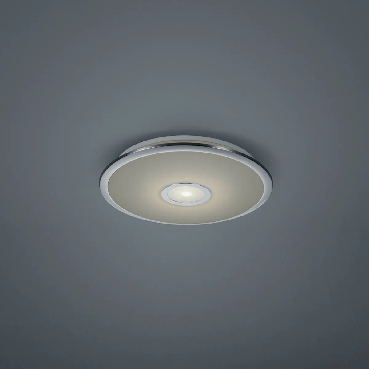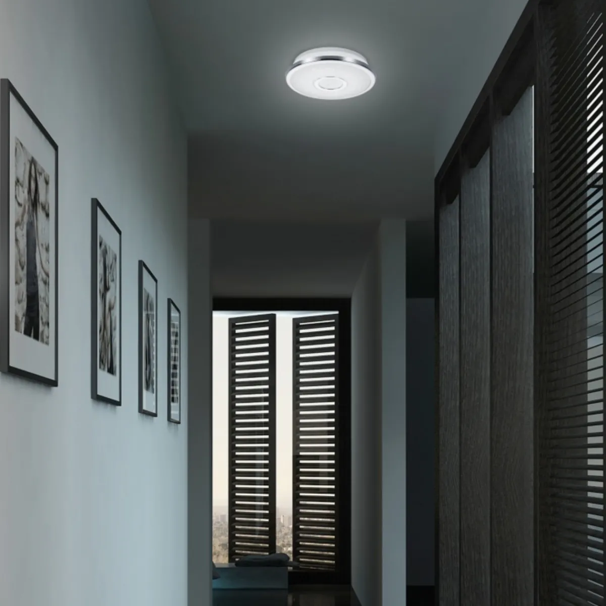 Taklampe som også kan brukes på vegg, med integrert dimmer og fjernkontroll, nattlysfunksjon, stjernelyseffekt, minnefunksjon, lysfargestyring og spesielt egnet for soverom.