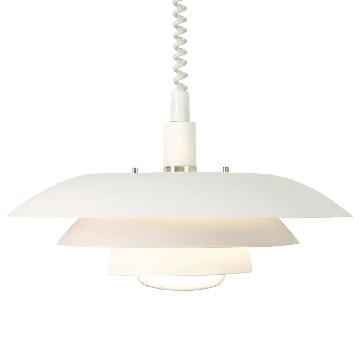 Den klassiske Epsilon taklampen med løftefunksjon kan enkelt senkes eller heves ved å trekke håndtaket ned eller skyve det opp. Lampen har tre skjermer i hvitlakkert metall som fordeler lyset på en fin måte og motvirker gjenskinn.