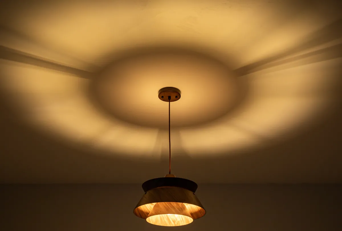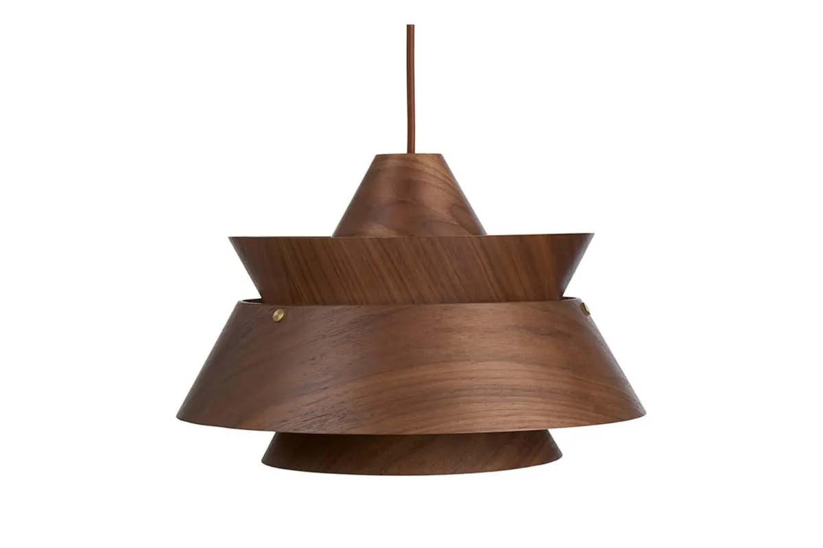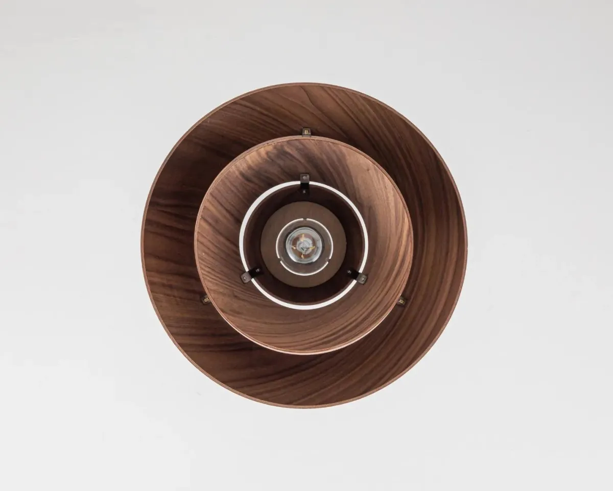Pendelen er laget av valnøtt, et eksklusivt og mørkt tre med en varm, naturlig glød. De fine kornene i treverket gjør hver lampe unik og understreker håndverkskvaliteten.