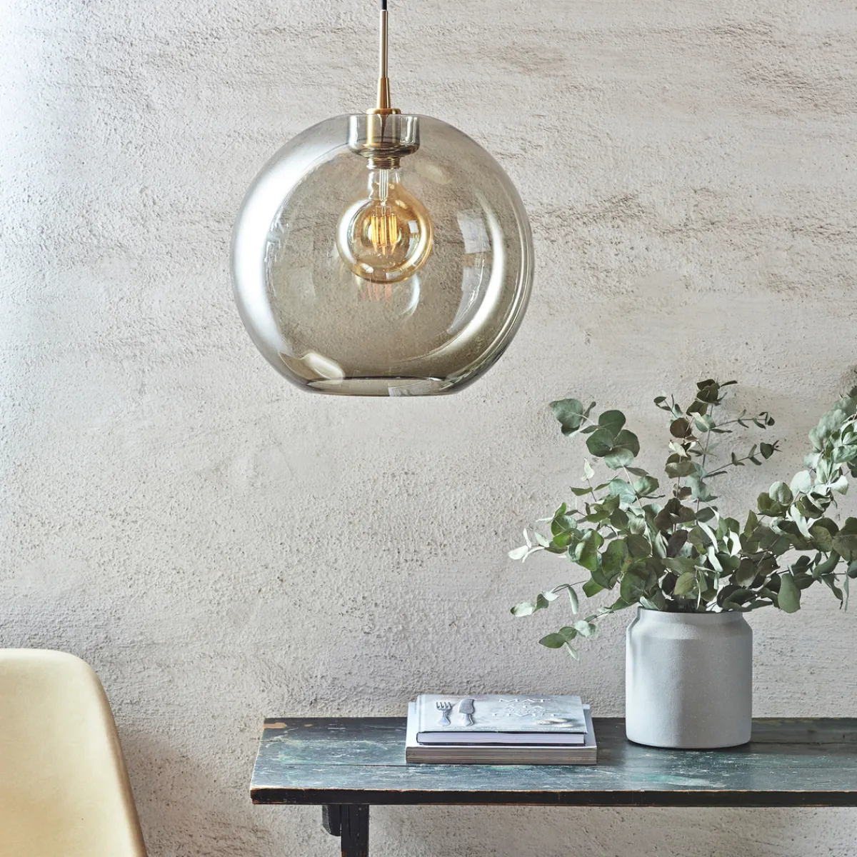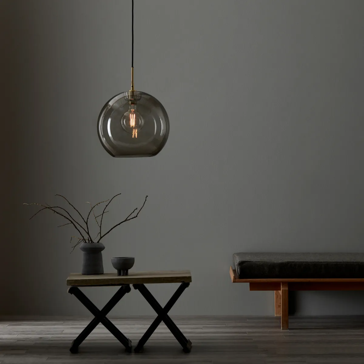 Belid sin populære og nydelige Gloria-pendel er nå i røykfarget glass. Lampen er egnet for montering på takkrok og leveres med 200 cm lang ledning som kan justeres i høyden. Du behøver en lyspære med E27-sokkel til lampen.