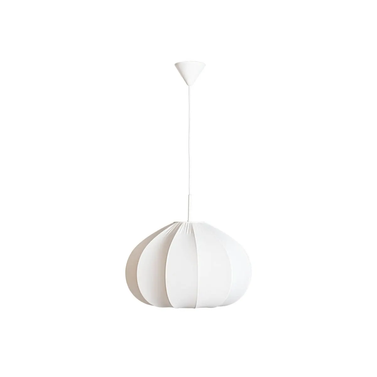 Dette er en lettplassert lampe som krever en stor E27-sokkel. Opphenget er i matt hvit metall og kompletteres av en hvit tekstilkabel, noe som bidrar til lampens elegante utseende.